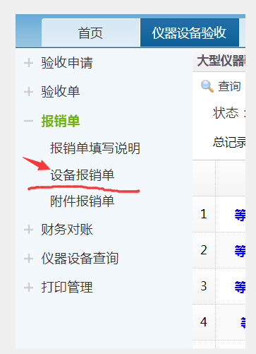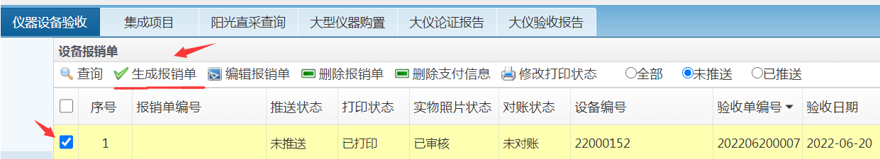 6、设备处完成审核后,100万以下大型设备就近选择自助终端打印验收单后。在“报销单”模块勾选已完成打印验收单设备,选择生成报销单完成财务信息填写。