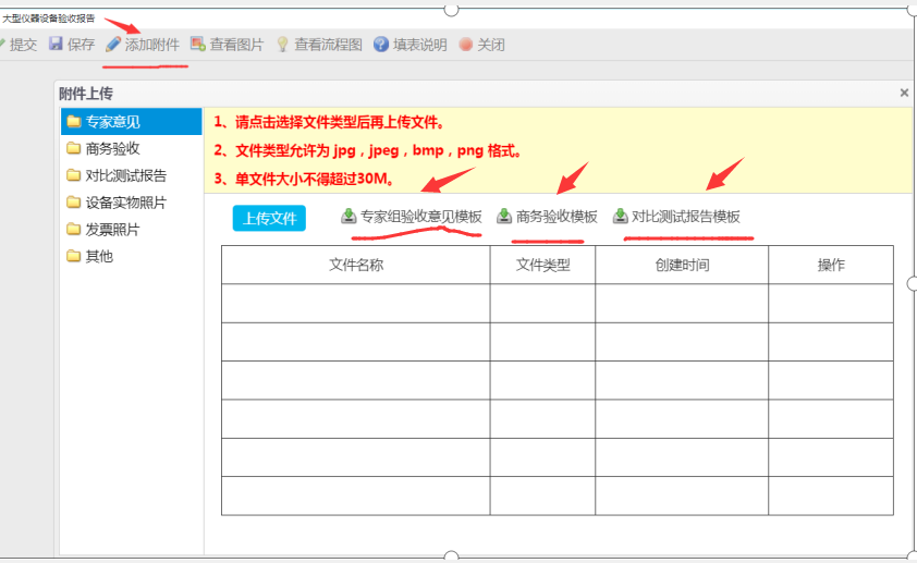 3、点击添加附件,分别上传专家意见、商务验收、对比测试报告、发票、设备实物照片等图片。相应材料模版可下载参考。