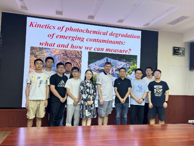 6月7-8日,Pozdnyakov博士分别开展了题为“Basic principles in optical spectroscopy and photochemistry and their application to study of photodegradation of emerging contaminants”和“Kinetics of photochemical degradation of emerging contaminants: what and how we can measure?”的专题报告。报告由浅入深地介绍了光化学研究中的常用方法、基于激光应用的时间分辨技术、用于研究光化学反应动力学的主要方法等,阐述了几种天然铁络合物的光化学行为并将其用于解决环境光化学问题的方法,以及如何利用光化学技术和量子化学DFT计算,确定部分PPCPs光解的短寿命中间产物。两次报告中讲述的研究方法对于进一步了解天然水和废水中的PPCPs化合物在天然和人工紫外线辐射作用下的转化途径具有重要意义。会上,老师和学生们与Pozdnyakov博士进行了充分的交流互动,深入讨论了针对激光闪光光解技术、表征方法、计算化学等方法用于光化学研究的经验及心得。