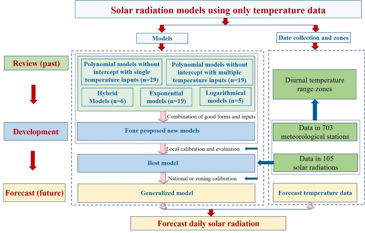 近日,能源类TOP期刊Renewable and Sustainable Energy Reviews在线发表了我院邱让建副教授基于气温预报太阳辐射的新进展。该研究回顾并改进了仅基于气温数据估算太阳辐射的模型,并成功基于天气预报气温数据对太阳辐射进行了预报。