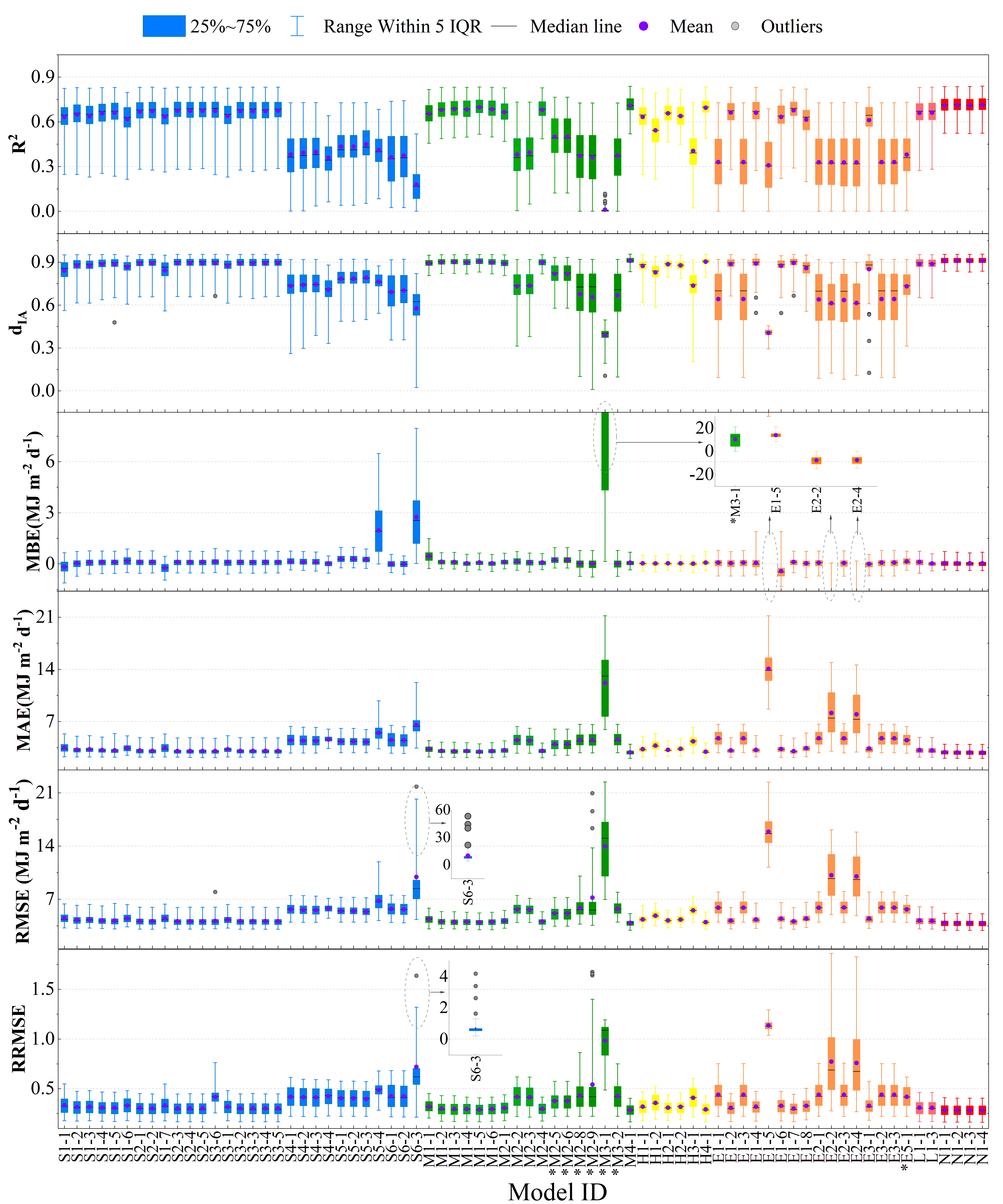 为此,该研究综述了78个仅基于温度估算太阳辐射的模型,并提出了4个新模型。基于中国105个太阳辐射站数据对82个模型精度进行了对比分析,筛选出了最优太阳辐射估算模型。整合数据集所有数据,获取全国通用的仅基于气温估算太阳辐射的最优模型的经验系数,可用于没有辐射观测区的太阳辐射估算,并可应用于天气预报的温度数据对太阳辐射进行短期预报。该成果最终将应用于基于天气预报温度数据预报作物的蒸散量,为作物合理的水分管理和区域水资源调度提供理论支撑。