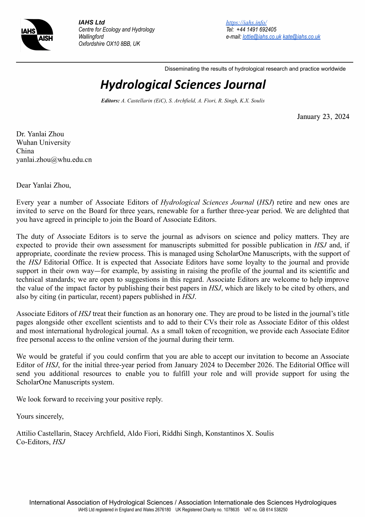 周研来教授受国际水文科学协会(International Association of Hydrological Sciences,IAHS)官方期刊水文科学杂志(Hydrological Sciences Journal,HSJ)主编Attilio Castellarin教授邀请,担任HSJ的副主编(Associate Editor),任期三年(2024~2026)。