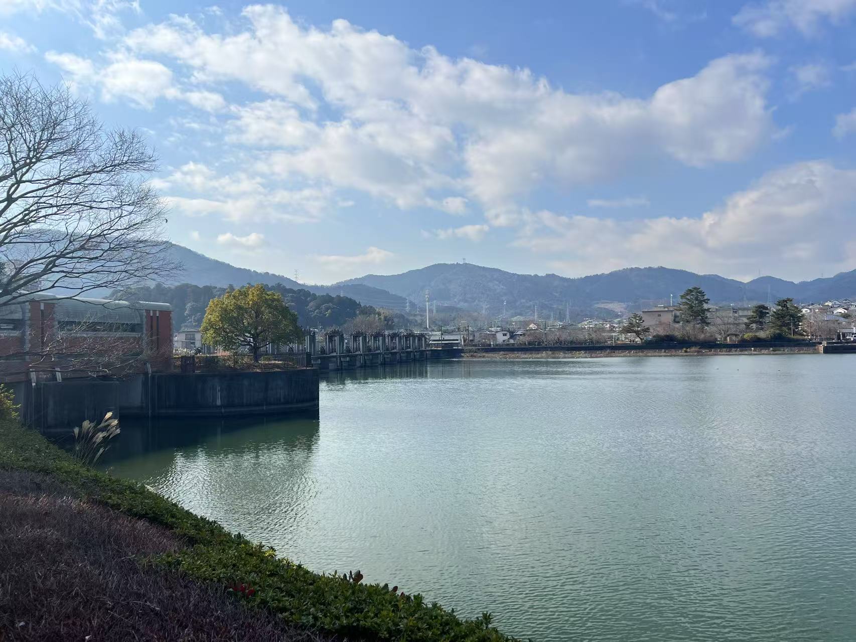 日本琵琶湖(Lake Biwa)是日本最大的淡水湖,湖泊面积达670km²,贮水量275亿m³,其综合治理一直是日本政府和地方当局的重点工作。为抵御洪水灾害,琵琶湖流域构建了“分级调控”体系:上游通过天濑大坝和濑田川洗堰控制泄洪流量,下游则以淀川堤防抵御洪水倒灌。1月22上午,两校师生考察了天濑大坝,京都大学小柴孝太老师介绍了大坝的基本情况。天濑大坝位于宇治川,坝下游淀川、桂川、木津川等多条支流相汇后注入大阪湾,致使下游地区长期深受洪水灾害困扰。天濑大坝在淀川流量较大时可控制下泄流量至160 m3/s,从而减小下游防洪压力。小柴老师介绍,由于坝后回水区域形似凤凰,故得名“凤凰湖“,以凤凰湖为下水库,在喜撰山上修建了上水库,进行抽水蓄能发电,上下库高差达200余米。