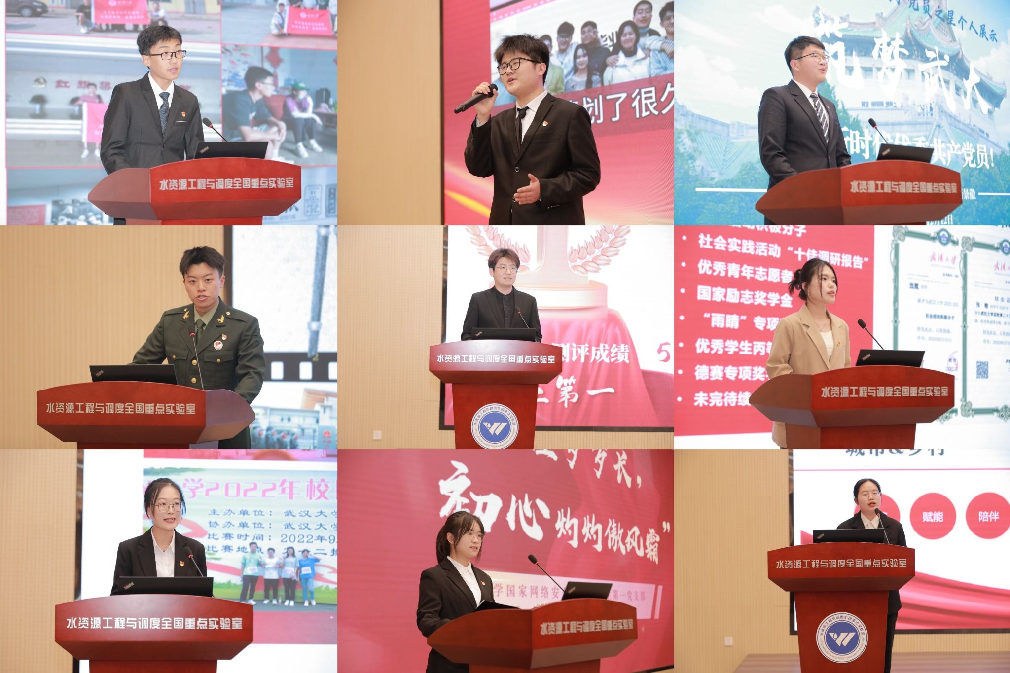 “启明星一号”卫星;学生党员孟敬然曾戍守边疆、完成国防任务,在部队里火线入党;学生党员官雅琪踏遍祖国河山,用实际行动“把论文写在祖国大地上”;学生党员余菀雅热心公益,在支教工作中点亮山区孩子前行之路;学生党员李越全心全意服务身边同学,在党支部中成长,又继续带领支部前行……随后的主题宣讲环节,每名候选人更是将总书记回信的内容和精神从自身经历和学科的视角出发,向大家展示出当代大学生党员的时代强音,在他们中,学生党员耿嘉骏展示了作为新时代水利人服务国家重大战略的使命担当;学生党员张敏以昂扬的斗志致力于为维护公平正义发出青年党员的光与热;学生党员郭柯辰树立将个人的奋斗融入网络强国建设的理想;学生党员王云帆表达了到祖国最需要的地方为人民和社会服务奉献的决心。