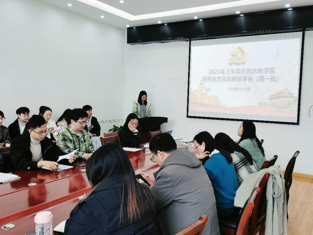 2025年上半年第一次研究生党员发展预审会在8111会议室召开。学院党委副书记左志香,研究生辅导员陈曼雨、许笑星、万柳柳出席会议。本次会议旨在严格对标党内关于党员发展的高标准、严要求,对发展对象的综合表现进行考核把关,选择符合党员发展要求的优秀同志进行发展。