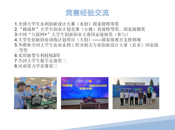 交流分享环节首先由周慧明同志分享竞赛经验,周慧明同志向大家分享了自己本科阶段的竞赛经历,向大家详细介绍了全国大学生水利创新设计大赛、“挑战杯”大学生创业计划竞赛等国家级竞赛的赛制安排,并为大家推荐了10余个可供参加的科创和学科竞赛,同时,为大家介绍了参加相关竞赛应具备的基本技能、学习的途径等。