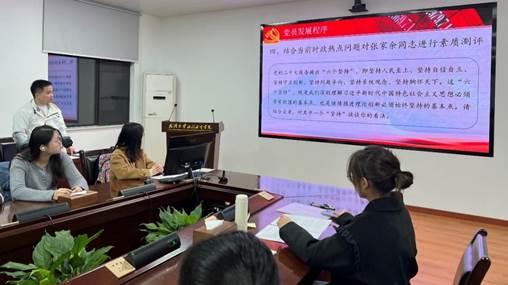 会议第二项,讨论张家余同志的发展问题。首先,全体起立奏唱国歌,经清点本次到会正式党员人数符合开会要求。随后,张家余同志汇报了发展期间的思想认知和自我鉴定。张家余同志在培养考察期间的考察人均一致表示赞同其发展。在素质测评环节,张家余同志结合实际和自身认识,对相关问题进行了回答。紧接着,入党介绍人及在场同志对发展对象张家余同志进行评价,表达对其肯定的同时,也为其指出了不足之处。最后,经在场的正式党员投票,张家余同志以全票赞成发展为中共预备党员。