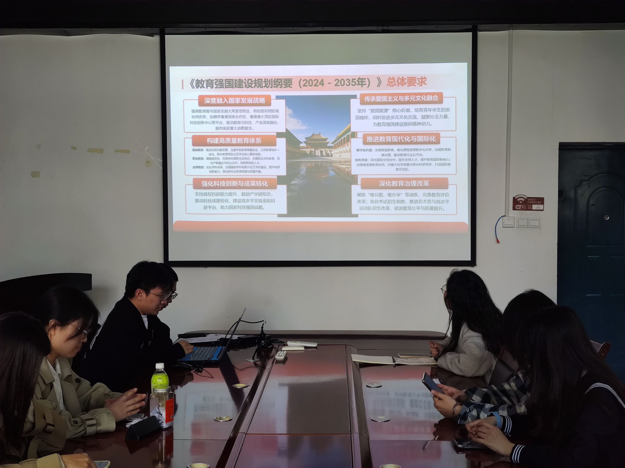 会议第二项,深入学习贯彻中共中央国务院印发的《教育强国建设规划纲要(2024-2035年)》。由汪俊松同志以PPT的形式分别从提出背景、学习目的、重要意义、总体要求和重要措施等五个方面进行阐述,呼吁支部成员在学习和科研的道路上注重提高将理论转化为解决实际问题的能力,明确新时代青年的使命担当,将个人的成长发展融入教育强国的时代洪流中,为新时代教育强国的建设注入青春活力。