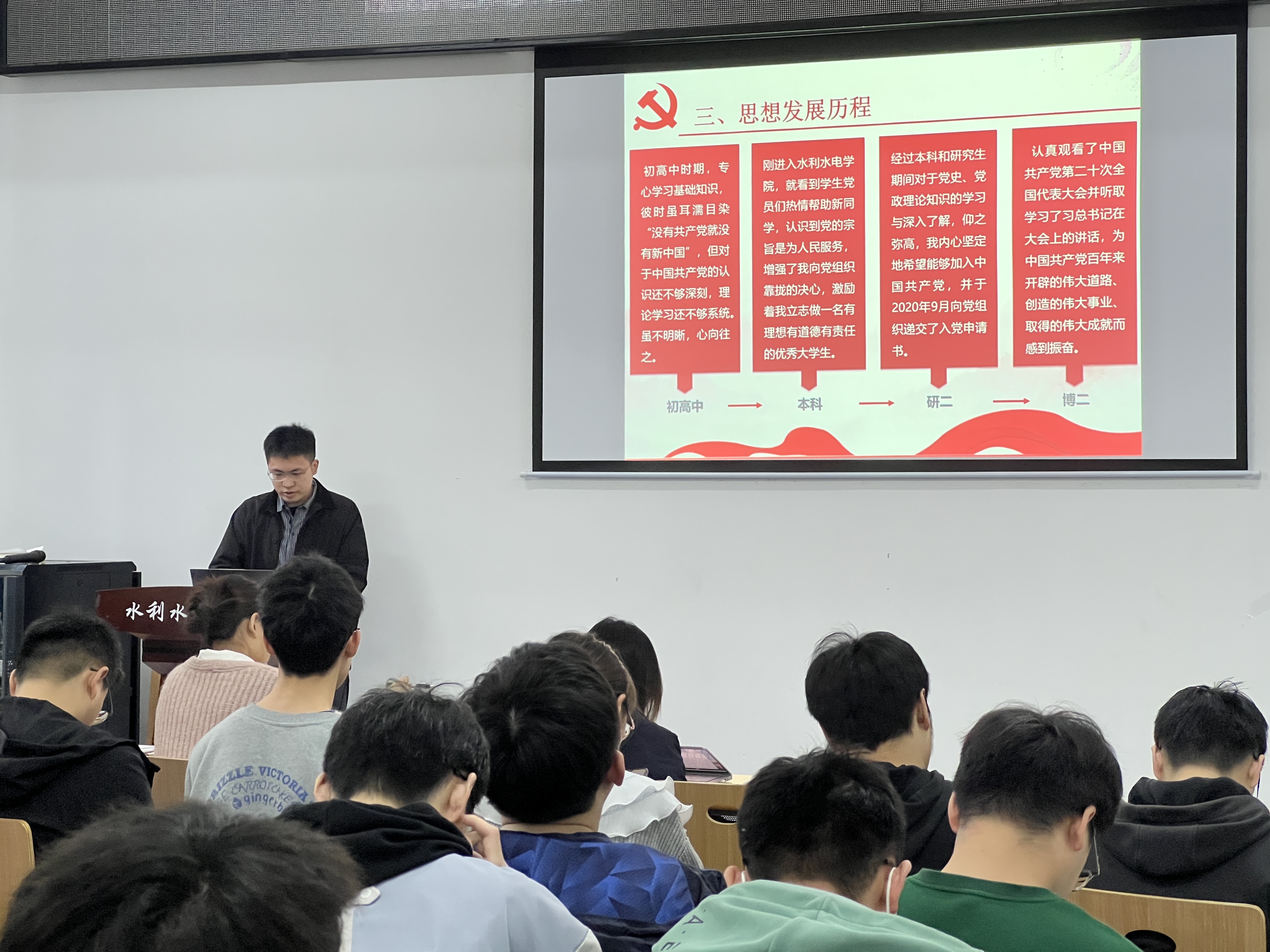 会议第一项,徐诗恬同志带领大家学习《推动绿色发展,促进人与自然和谐共生》主题党课。习近平总书记在党的二十大报告中提出了“推动绿色发展,促进人与自然和谐共生”的要求,指出“必须牢固树立和践行绿水青山就是金山银山的理念,站在人与自然和谐共生的高度谋划发展”。徐诗恬同志从四个方面向大家讲解了习近平生态文明思想。首先,徐诗恬同志为大家介绍了习近平生态文明思想的时代背景和理论来源,在生态环境日渐恶化的国际背景之下,基于我国现代化进程中的生态难题和深化供给侧结构性改革的需要,需要强调协调好经济社会发展和生态环境、绿色低碳发展和生态经济之间和谐共处的关系。接着,徐诗恬同志对习近平生态文明思想的重要观点进行分析,主要包括坚持人与自然和谐共生、绿水青山就是金山银山、推进绿色低碳发展、统筹山水林田湖草沙系统治理、实行最严格的生态环境保护制度和共建地球生命共同体共六个方面。徐诗恬同志还带领大家学习了习近平生态文明思想的价值与意义,习近平生态文明思想为新时代生态文明建设和美丽中国建设提供了明确方向,也是构建人类命运共同体和实现中华民族伟大复兴的内在动力。最后,徐诗恬同志强调水利行业与生态文明建设息息相关,调水储能作为清洁能源开发利用模式,可有效提高电网的负荷调节能力,具备可靠性和稳定性的特点,对碳达峰碳中和具有积极作用且对生态环境的影响相对很小。