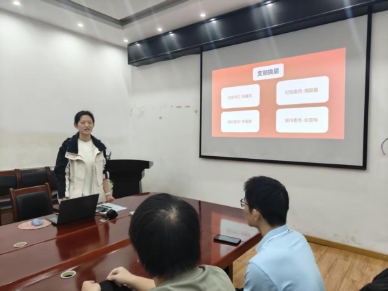 会议第一项议程,由张馨月同志向全体新生介绍支部情况,内容包括支部全称、支部组成与党员发展积分细则,同时充分调动非党员同志的积极性,与会同志发表创新交流,共同商讨新颖的支部学习形式。