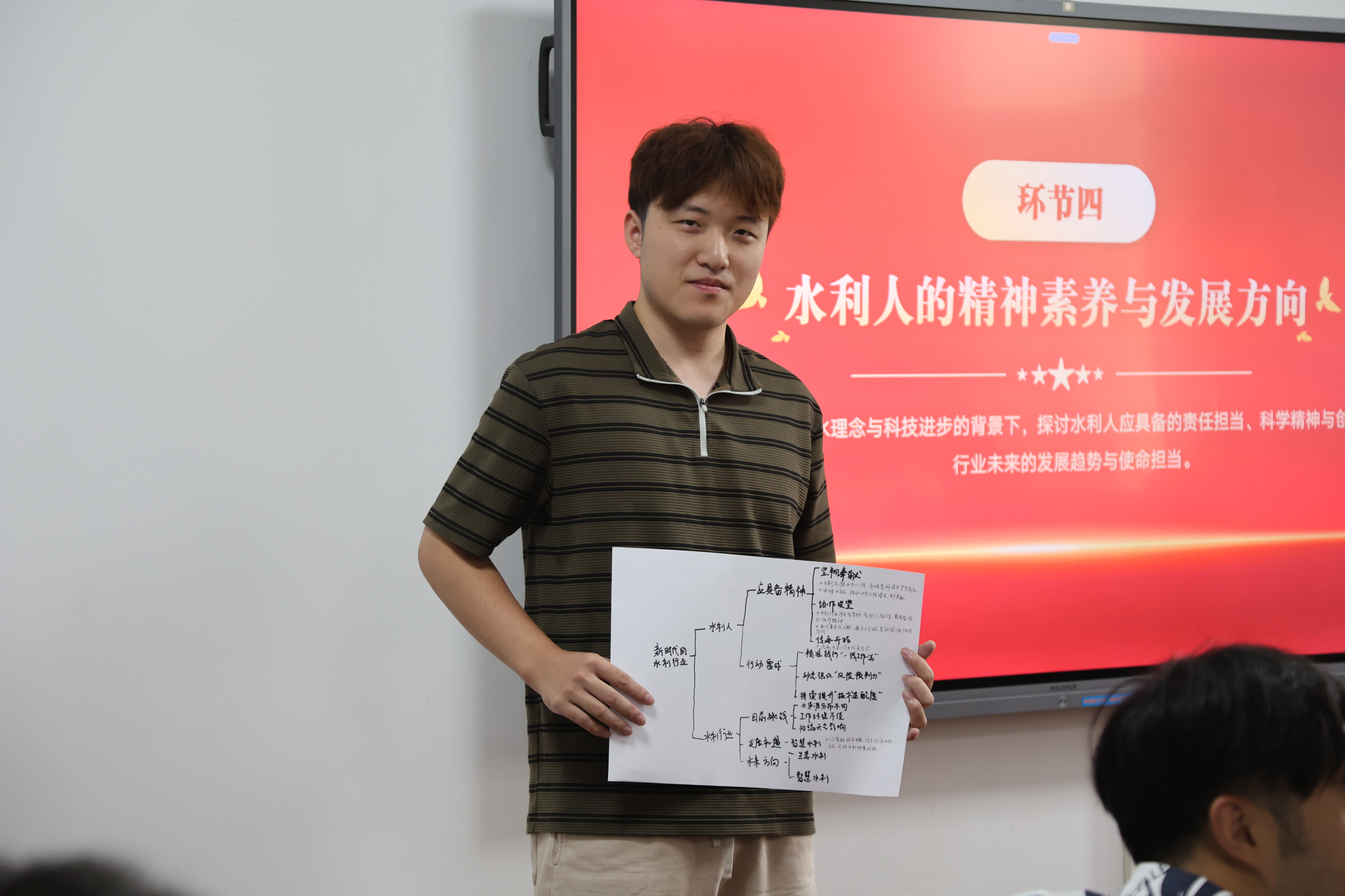 随后,全体成员分成多个小组,围绕“新时代水利人的精神内核与行动要求”以及“行业发展的挑战与机遇”两大主题展开热烈讨论。各小组将讨论结果整理生成思维导图,并进行了展示分享,进一步深化了大家对水利人的精神和行业发展方向的认识。
