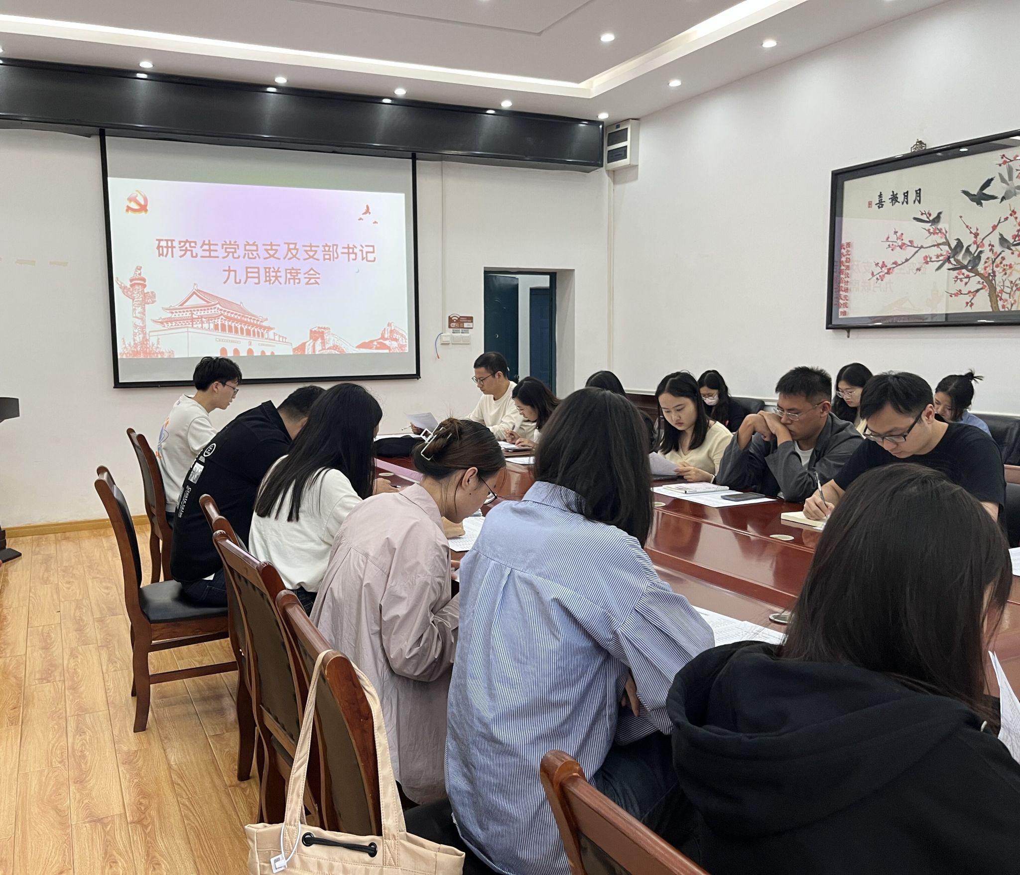 研究生党总支于2023年9月21日16:00在8111召开9月研究生党总支委员及支部书记联席会,学院党委副书记左志香老师,研究生辅导员陈曼雨老师、许笑星老师和研究生兼职辅导员万柳柳老师,党总支委员、各党支部书记参加会议。会议由研究生党总支副书记童政同志主持。