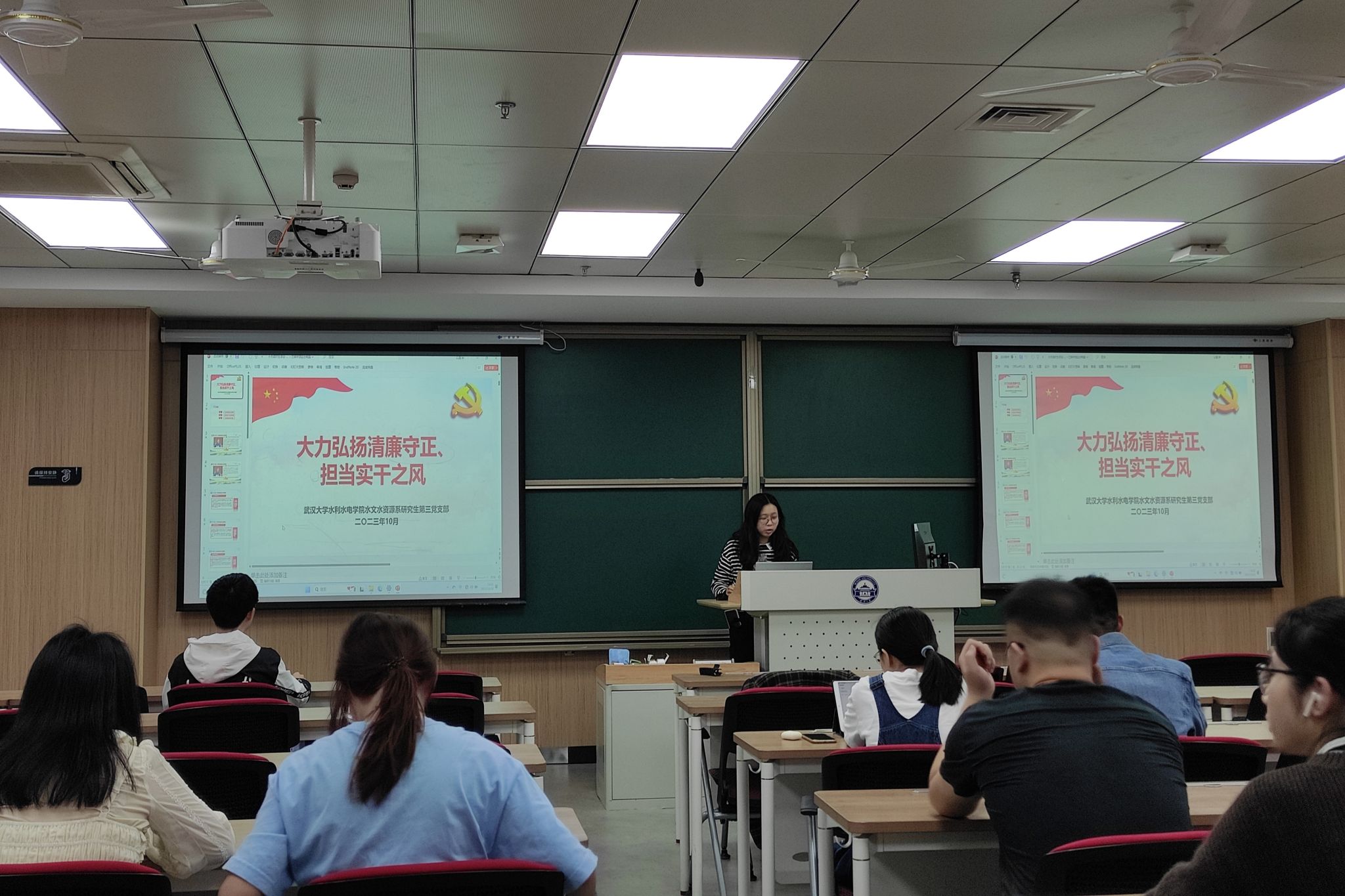 会议第一项,由钟以磊同志带来理论学习分享,分享内容:习近平总书记关于党的自我革命战略思想和全面从严治党重要论述。习近平总书记强调,要弘扬清廉之风,教育各级党员干部牢固树立正确权力观,全面查找廉洁风险点,筑牢思想防线,坚守法纪红线。习近平总书记深刻阐述了通过集中教育推动全党以自我革命精神解决党风方面突出问题的重要意义,系统论述了“以学正风”的丰富内涵,为广大党员干部划定了思想“红线”。会议过程中还进行了党风廉政建设相关新闻的收看以及相关案例的讲解学习,并开展党风廉政知识测试,同学们认真地学习理论知识并积极主动地回答问题。