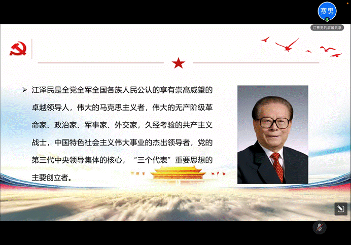 会议第一项,江赛男同志带领大家学习江泽民同志的生平。首先,她回顾了江泽民同志伟大光辉的一生,深切缅怀江泽民同志为党和人民建立的不朽功勋,她从江泽民同志在不同时期为党和国家做出的伟大贡献出发,带领大家学习江泽民同志的生平,在江泽民同志一生伟大光辉的事迹中,大家认识到党中央领导集体的核心对党和国家事业发展发挥的关键作用,也更加认识到如今中华民族取得的发展来之不易。伟人已逝,风范长存。江泽民同志的革命精神和革命风范永远铭刻在每一位同志的心中,永远教育和激励新时代青年前进。