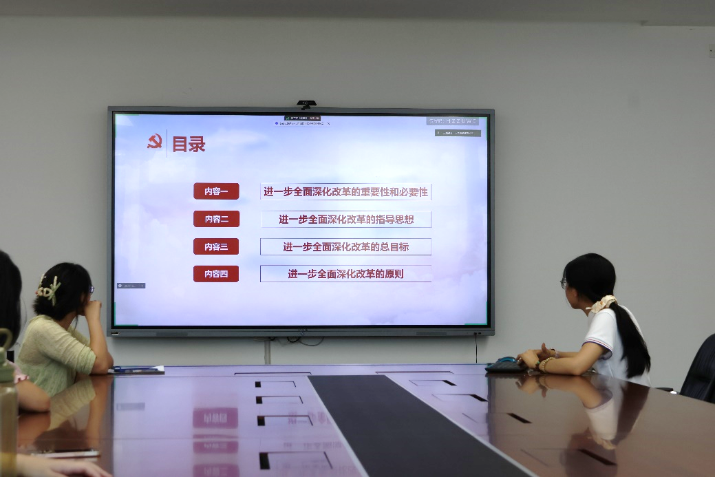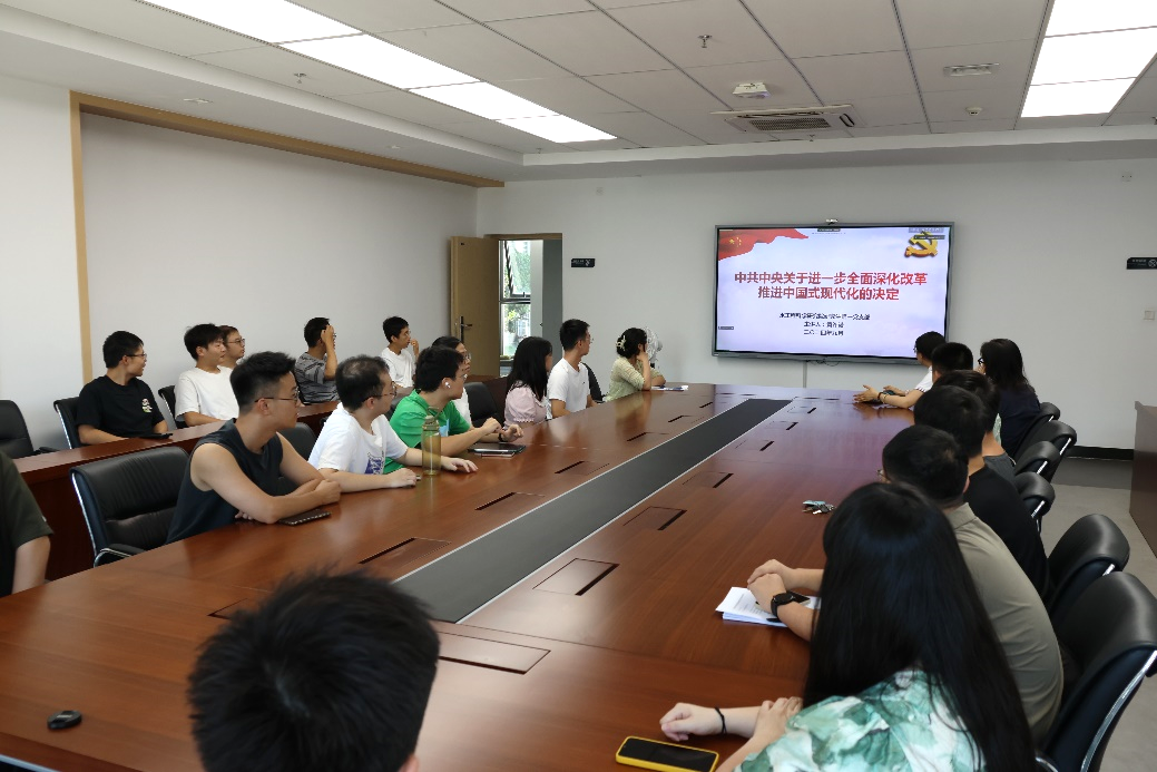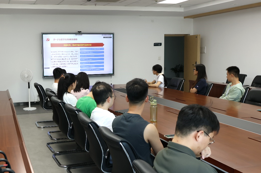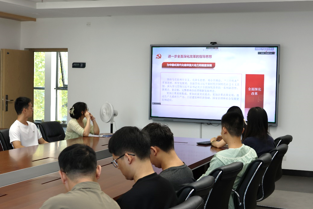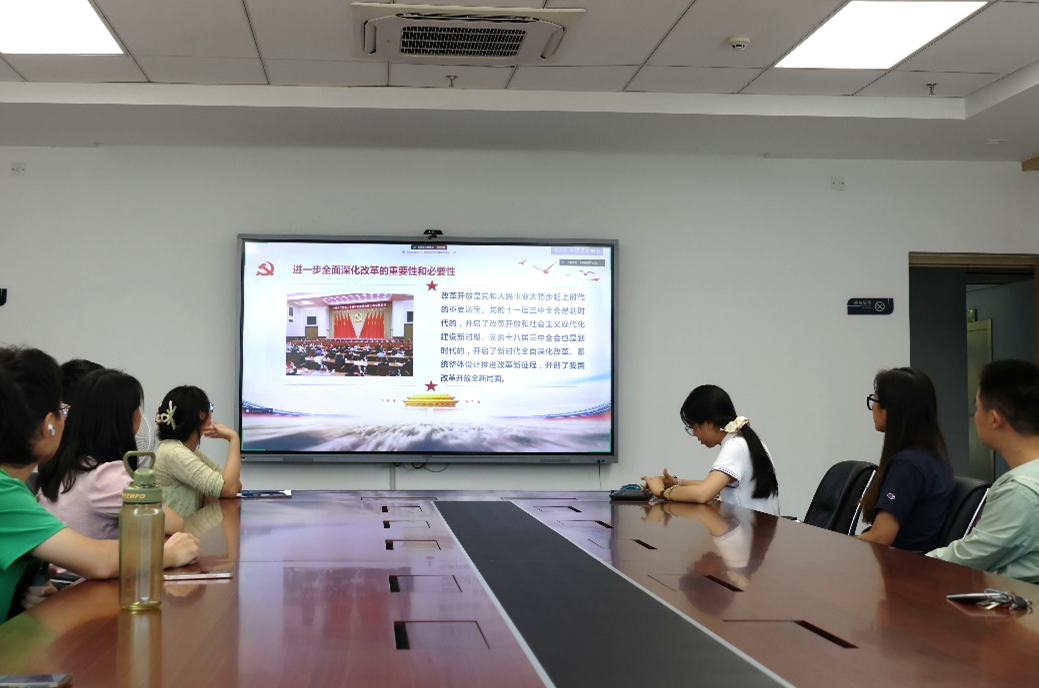 黄许诺同志以PPT讲解的方式带领支部成员学习党的二十届三中全会发表的《中共中央关于进一步全面深化改革、推进中国式现代化的决定》文件精神。学习内容主要包括进一步全面深化改革的重要性和必要性、进一步全面深化改革的指导思想、进一步全面深化改革的总目标、进一步全面深化改革的原则。