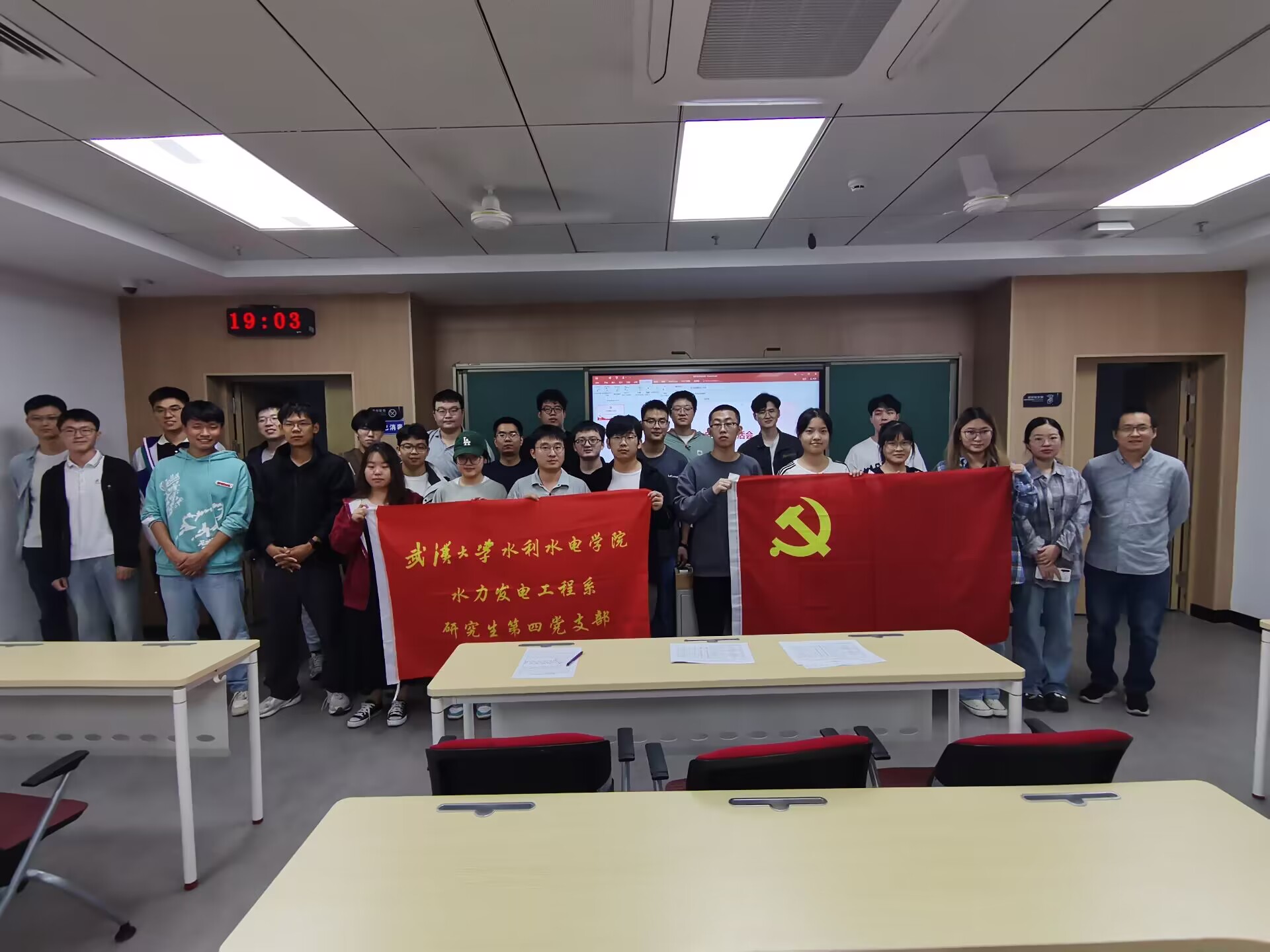2024年10月14日下午7点,水力发电工程系研究生第四党支部在工学部主教A103教室召开10月组织生活会,本次会议主题为:共庆华诞,共话七十五载砥砺奋进路。会议由党支部书记李斌誉同志主持,到场同志41人,其中党员同志33人,正式党员32人,预备党员1人。