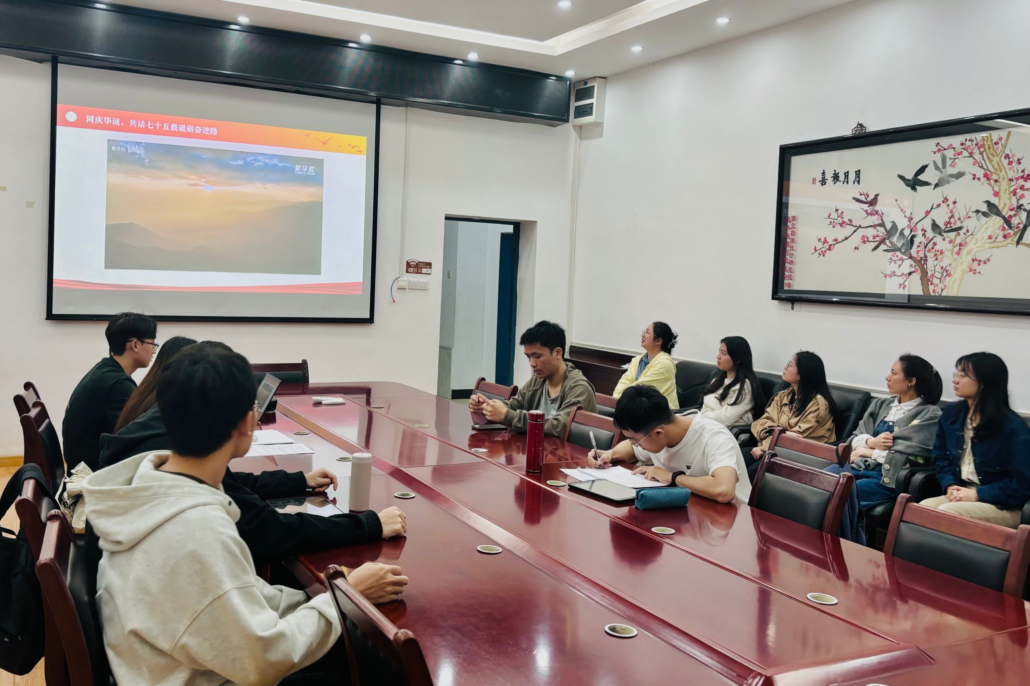 会议的第二项是共同观看国庆主题视频,同庆华诞,共话七十五载砥砺奋进路。由张恒同志领学。在视频的主旋律中,支部全体成员仿佛走入了这段历史之中,回顾了这75年来的艰辛和坚持。75年以来,中国共产党领导全国各族人民同心同德、艰苦奋斗、开拓进取,创造了社会主义革命和建设、改革开放和社会主义现代化建设、新时代中国特色社会主义的伟大成就,中华民族迎来了从站起来、富起来到强起来的伟大飞跃,一幅波澜壮阔的历史画卷在徐徐绘就,一曲气壮山河的奋斗赞歌正接力谱写。在视频结尾,习近平总书记的讲话更是振奋人心:“中国的昨天已经写在人类的史册上,中国的今天正在亿万人民手中创造,中国的明天必将更加美好!”在观看视频之后,张恒同志也提出号召,我们党团结带领全国各族人民历经风雨洗礼,才铸就了今日的辉煌盛世,作为新时代的青年学生,只有铭记历史,才能更好地前行。