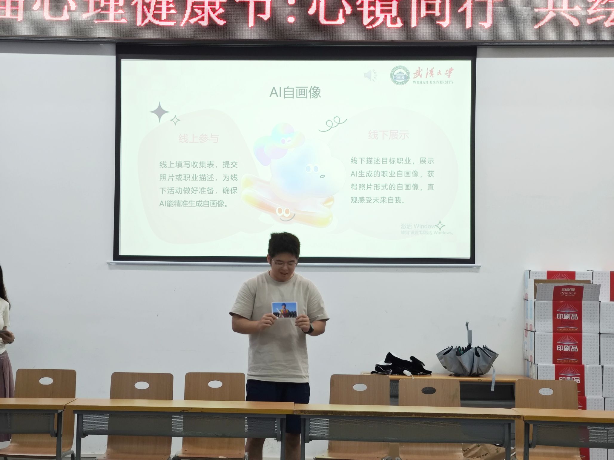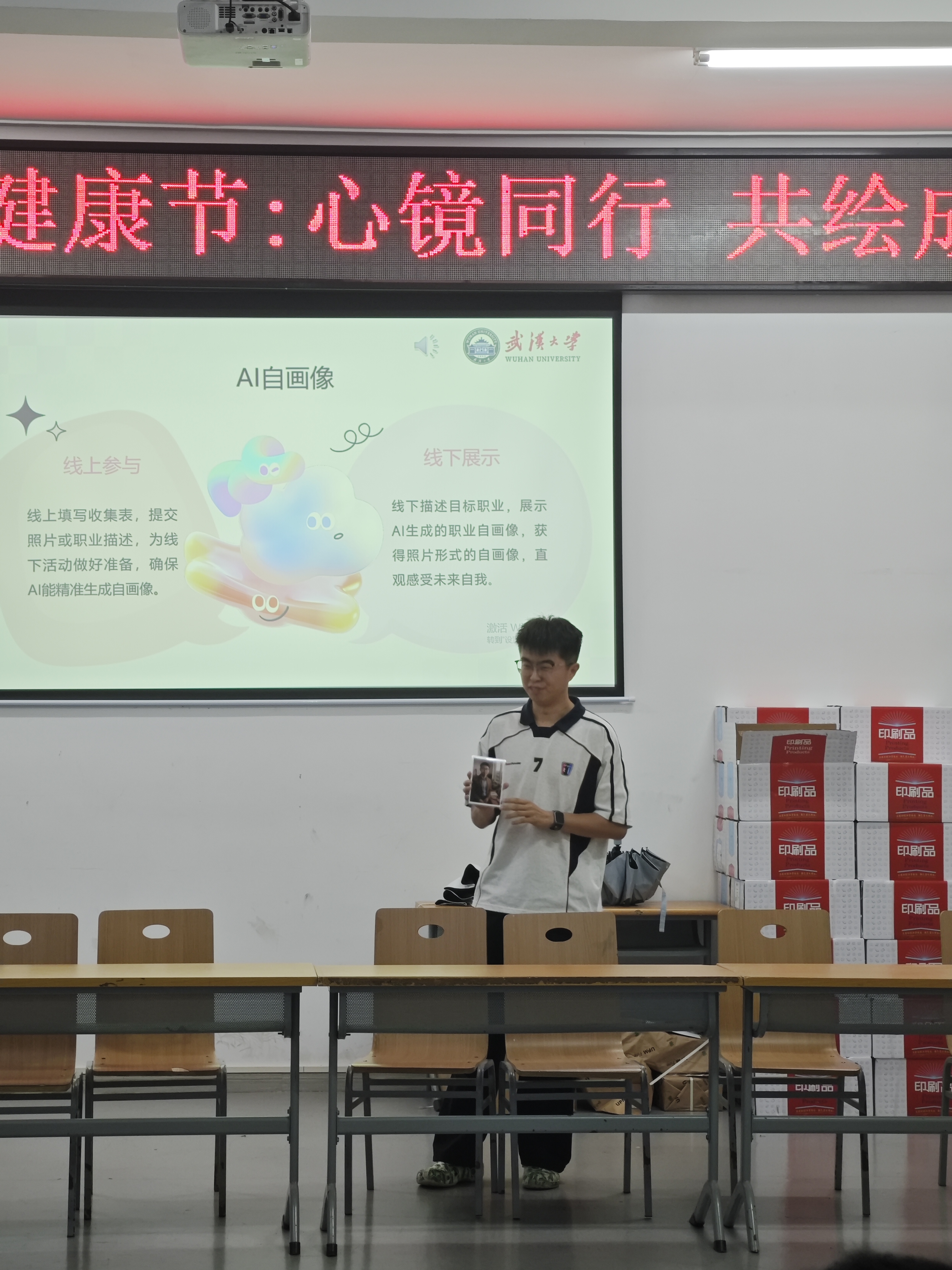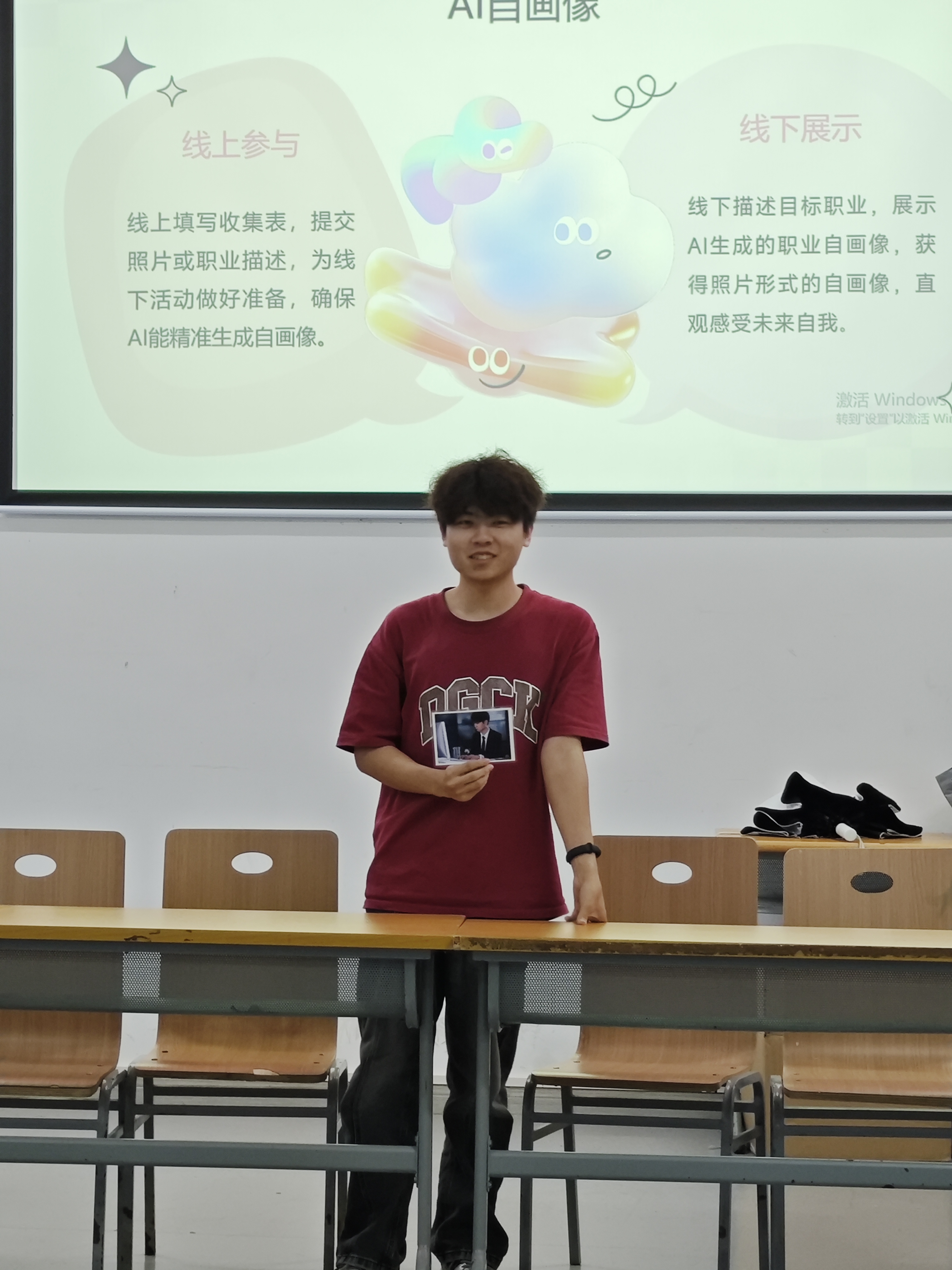 第二环节“AI职业自画像”则聚焦于未来的展望。活动前提交了未来职业文字描述的同学,此刻惊喜地收到了由AI技术生成的个人职业形象照片。拿到照片后,大家纷纷上台分享自己对职业的理解和憧憬。“我以后想要去设计院,当设计师!”、 “工作之余我想养一只猫,弹弹吉他。”场上的声音渐渐多了起来,愈发坚定有力,此起彼伏。大家目光专注,聆听着同学们满怀希望地描绘未来的自己,每个人心中那份对未来的期许也被悄然点燃。