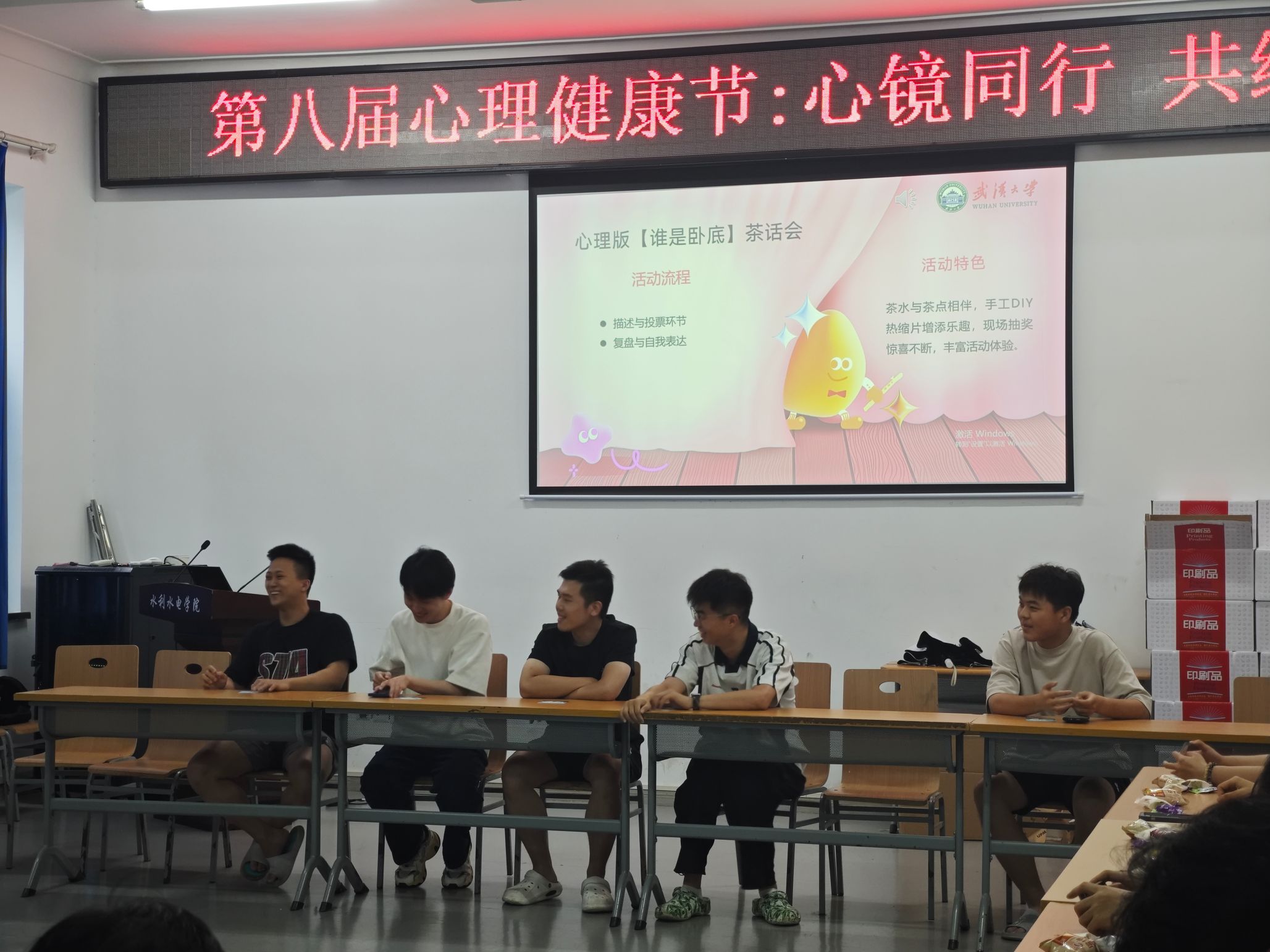 首轮活动是改编版的“谁是卧底”心理游戏。同学们分组围绕“焦虑/抑郁”、“体面/懦弱”等蕴含情感张力的词对展开描述与猜测。大家结合自身的学习和生活经历畅所欲言,有的坦诚分享实验失败后的心路历程,有的讲述生活中的趣事。这些真实的分享引发了现场阵阵会心的笑声和共鸣。通过这种轻松有趣的互动模式,结合自己对词卡的理解描述,大家在游戏中分辨敌友的同时,也在交流中对探寻自己心底的声音。