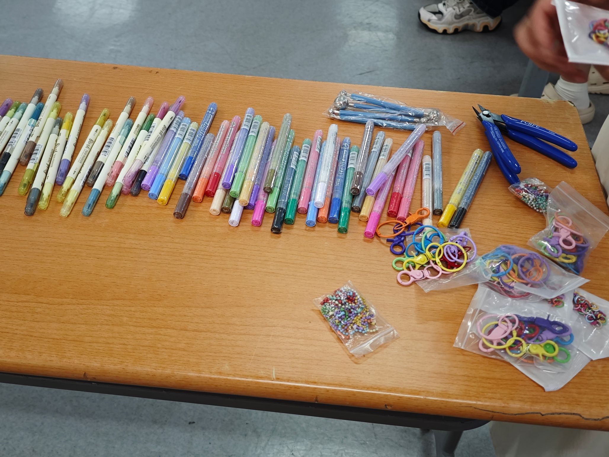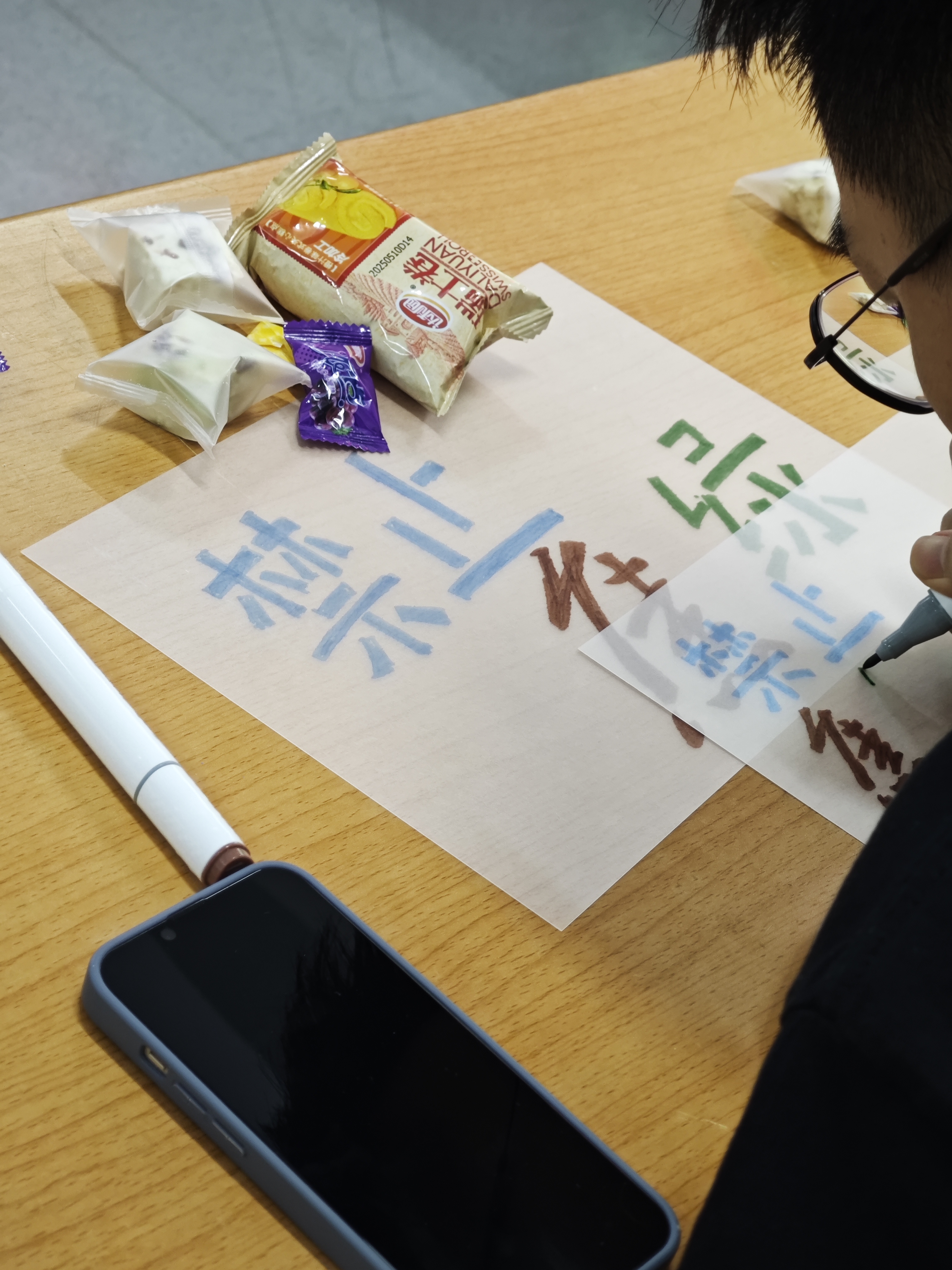 第三环节是充满疗愈感的手工热缩片钥匙扣制作。同学们在空白的胶片上挥洒创意,用颜料写下真挚的祝福或绘制心仪的图案。“禁止蕉绿”、“平安喜乐”、“实验顺利”等充满生活气息的祝愿语跃然其上,也有同学选择了可爱的简笔画或钟爱的歌词片段。随着热风枪吹出暖风,大家好奇而专注地看着自己亲手绘制的图案渐渐收缩、变硬、定型,最终成为一件件承载着个人心意与祝福的独特饰品。亲手制作的过程本身,就是一种专注的放松和积极的自我表达。“感觉整个过程很放松有趣,也认识了一些其他学院的朋友,非常期待下一期的活动。”来自土木建筑工程学院的一位同学道出了大家的心声。