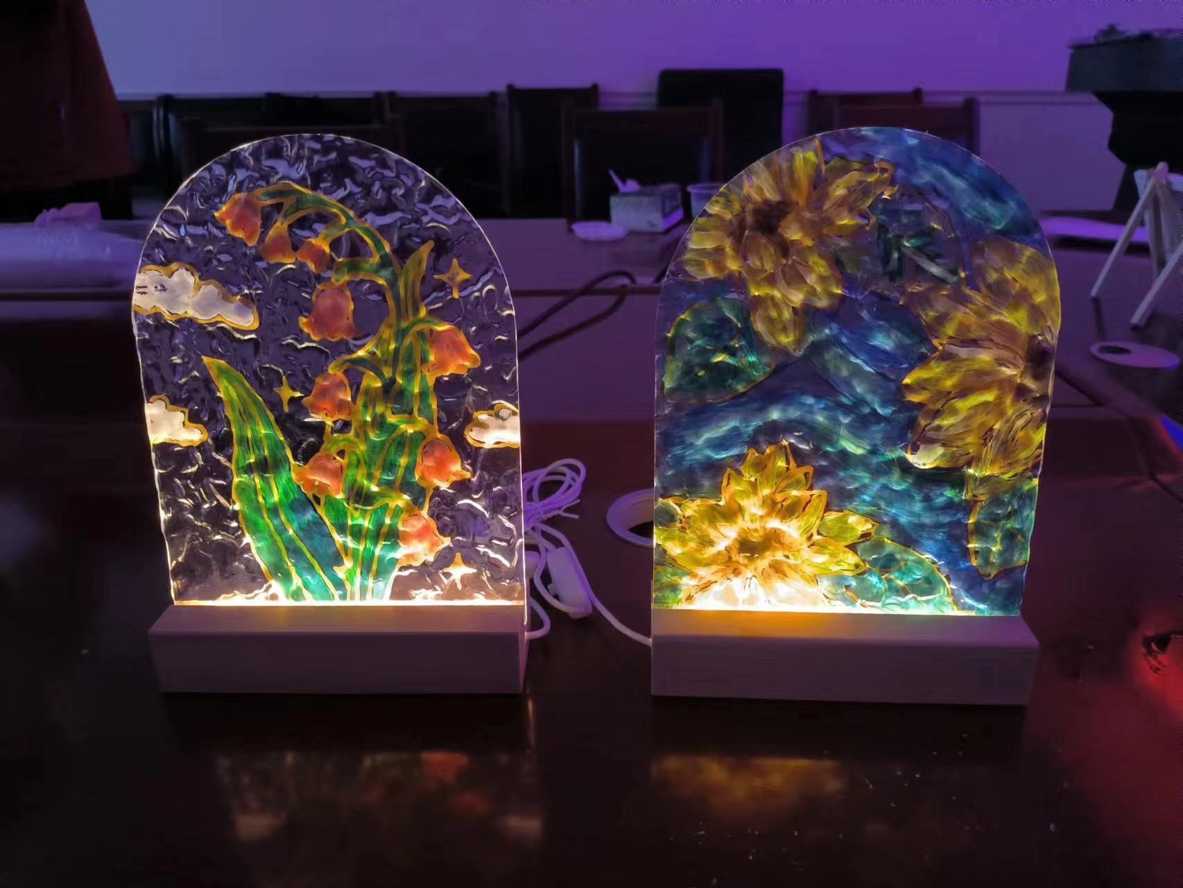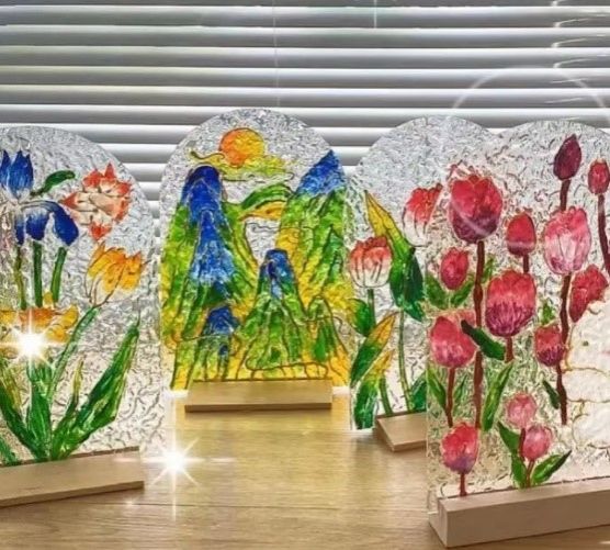 选好心仪的图案垫在玻璃灯板下,用颜料勾勒出图案的形状并填色,等待颜料固化,将玻璃灯板插上电源,就收获了流光彩溢的氛围灯一枚~