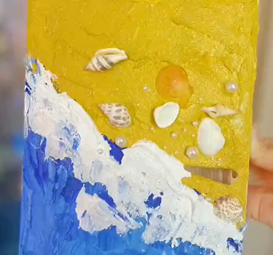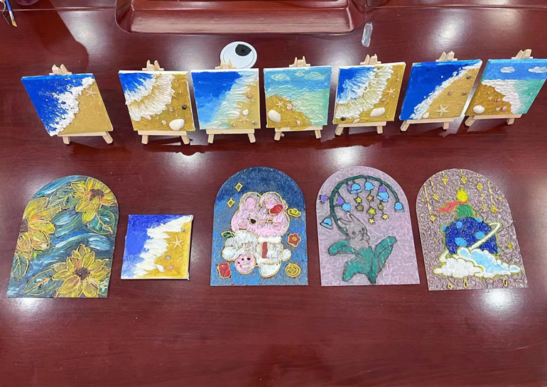 选好心仪的图案,将丙烯颜料和石英沙材料混合,再以小铁铲为画笔,就可以作出漂亮的肌理画啦~