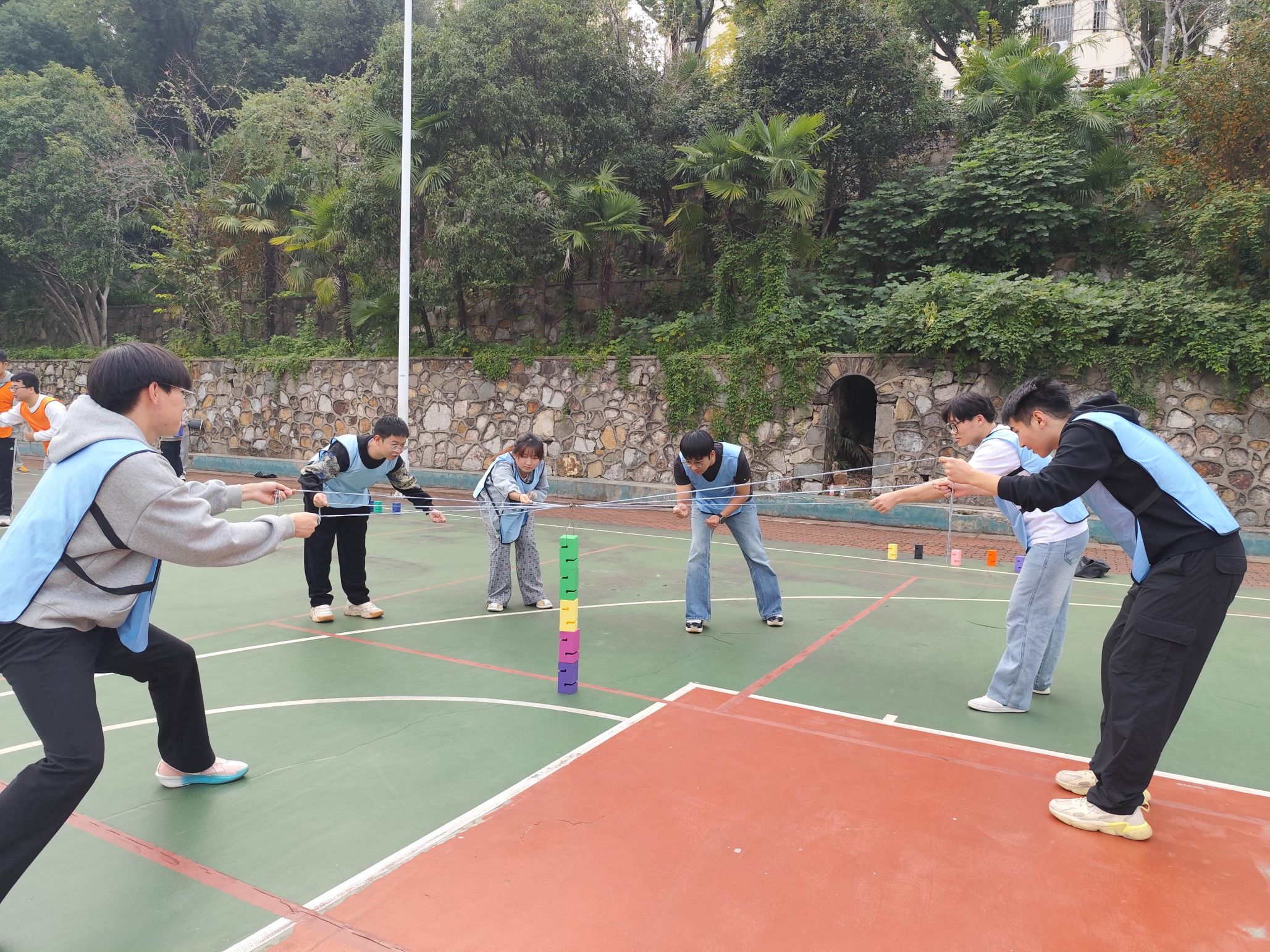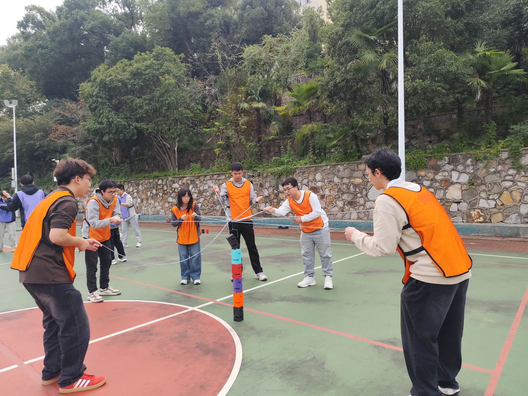 首先,队员们进行了“步步高升”游戏。每组成员合力控制绳子叠出十层的高塔,这对团队沟通与协调性提出了要求。这项活动让大家更加默契,为后续精彩的活动奠定了基础。