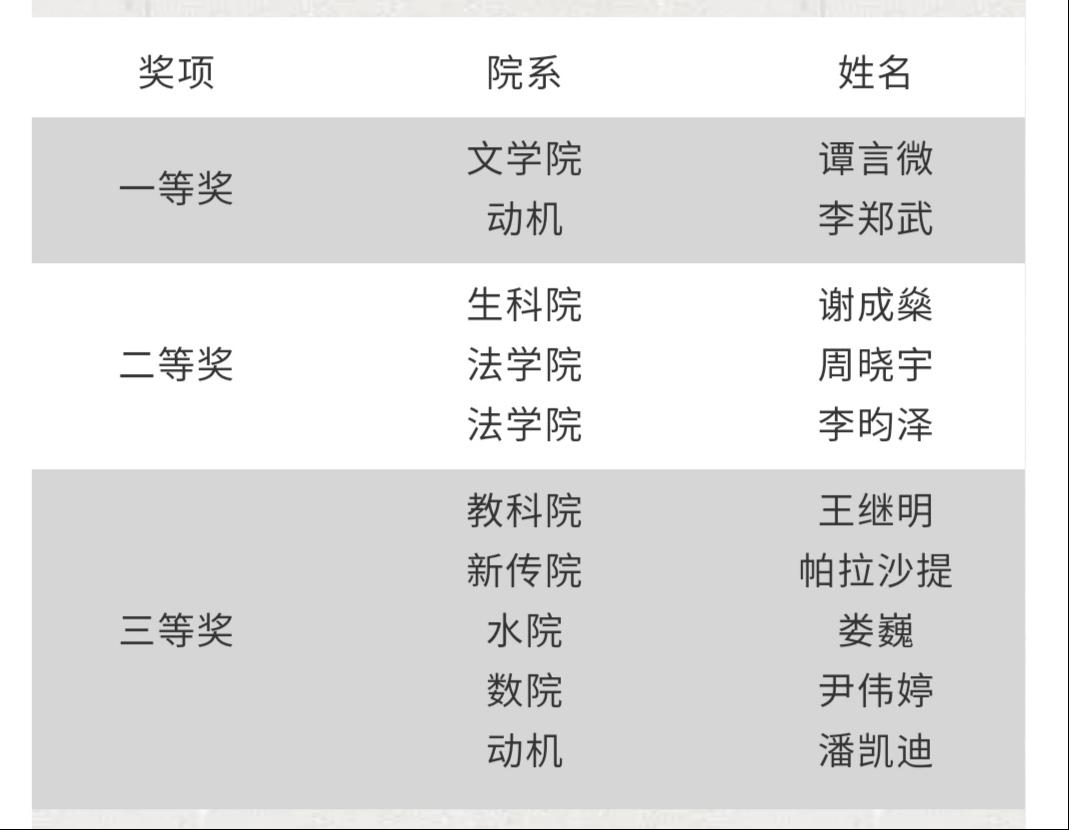 研究生,采取录音投稿形式,由专业评委打分,取平均分最高的15位选手进入决赛。决赛于“全民k歌”app歌房进行,分为两轮,第一轮各位选手依次献唱,根据专业评委和现场大众评审的打分,得分前十名者进入第二轮;第二轮各位选手由第一轮得分倒序出场,分别演唱后决出本次比赛的一、二、三等级及优秀奖。最终,经过了激烈的角逐,来自文学院的谭言微和动机学院的李郑武获得了本次比赛一等奖。我院研究生娄巍获得三等奖的佳绩。