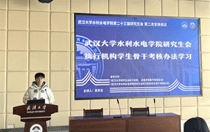 研究生会执行机构学生骨干考核办法”相关内容,深入开展骨干培训工作。吴京龙同学围绕考核办法详细介绍了考核内容、考核方式及细则、考核结果及运用等相关内容,同时他再次强调了研究生会成员应当保证自身纪律作风端正,远离红线、坚守底线,一同致力于建设一个高水平、高质量的水院研会。