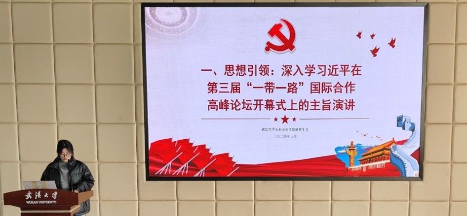 首先,主席团成员贾璐蔓对研究生会成员开展理论学习专题骨干培训工作,领学“思想引领-习近平在第三届‘一带一路’国际合作高峰论坛开幕式上的主旨演讲”。贾璐蔓同学带领研会全体成员回顾了习近平总书记在第三届“一带一路”国际合作高峰论坛开幕式上的主旨演讲,并详细解读了总书记在演讲中的指示和传达出的精神。