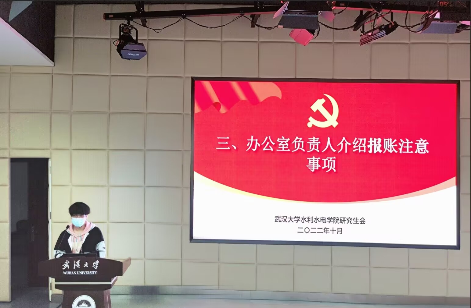 随后进行了专题培训。院研究生会办公室负责人林杰同学讲解研会报账的相关注意事项。林杰同学从开发票、各部门汇总账单、向办公室提交报账材料三个方面进行了较为详细的叙述。院研究生会新媒体宣传中心负责人熊诗琪同学讲解了“水研珞珈”公众号推文稿的流程和规范。熊诗琪同学谈了推文稿三个方面的要求:一是要保证投稿内容的完整和排版规范化,部门负责人在投稿前对稿件进行修改和审核后再进行投稿;二是投稿时确保标题、封面图、原文链接的完善,图片清晰并注明图片和文字的来源;三是注意投稿时间,投稿一般需要提前一天发送,需要紧急投送的稿件,要在下午五点前发送;四是稿件的审核,再稿件发布前,会将微信预览发送给投稿同学进行审核,确保内容准确无误,及时发送。