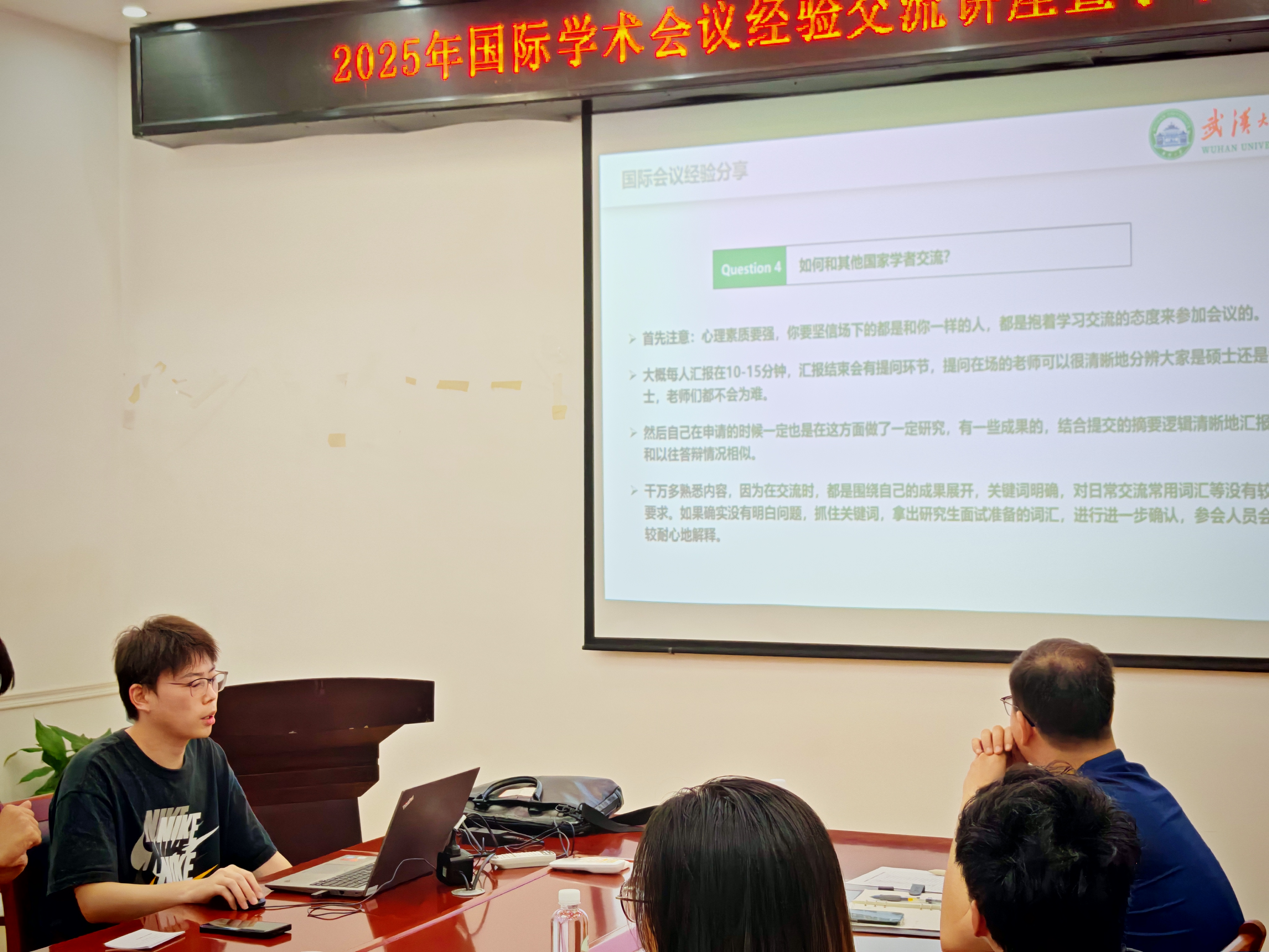 国际会议申请流程、国际会议基本流程、如何与其他国家的学者交流等四个方面与同学们交流。他表示参加国际会议心理素质要强,需要借鉴以往答辩经验,结合提交摘要的逻辑进行清晰的汇报,一定要多熟悉内容,关键词明确。