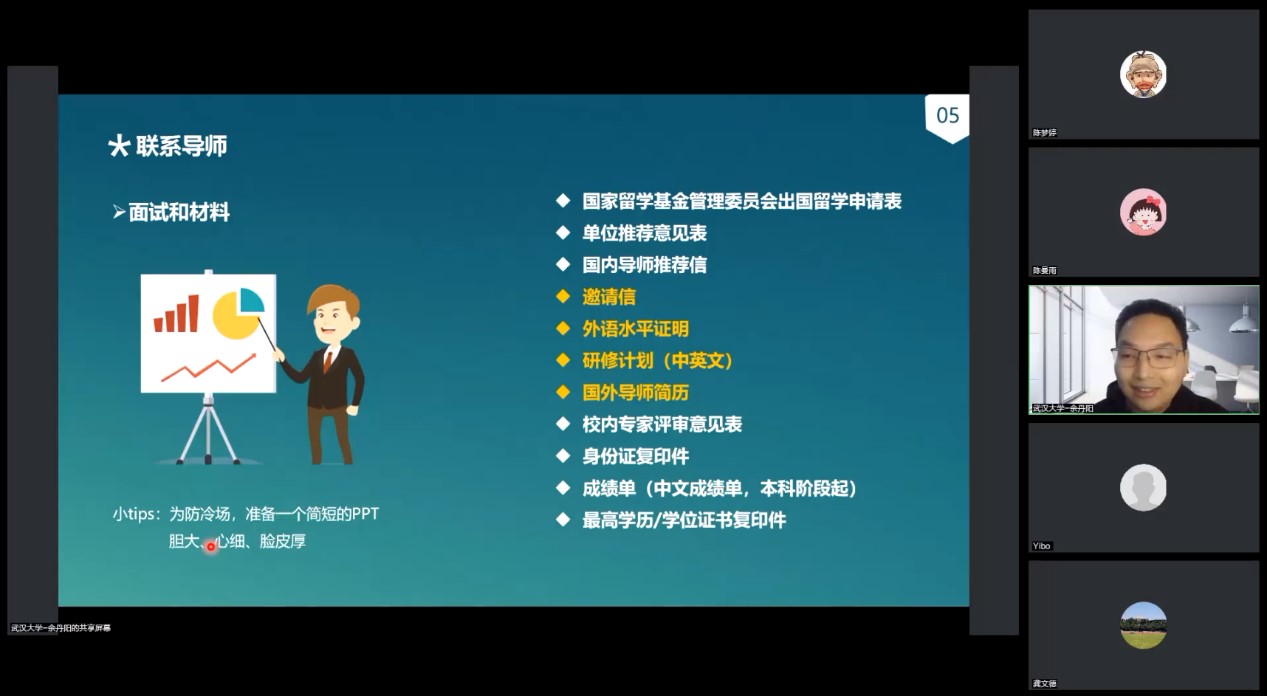 最后余丹阳从联系导师、改派申请和留学日常三方面分享了留学经验。他的留学院校为荷兰特文特大学。联系导师方面,他推荐了三条认识国外导师的途径:一是由导师推荐或者通过学术会议等提前熟悉,二是通过论文或者ResearchGate等学术交流网站,三是通过学校官网。之后他介绍了套磁信和CV的制作要点,以及面试材料的准备。之后他还讲述了改派申请。最后余丹阳分享了自己丰富的留学日常。