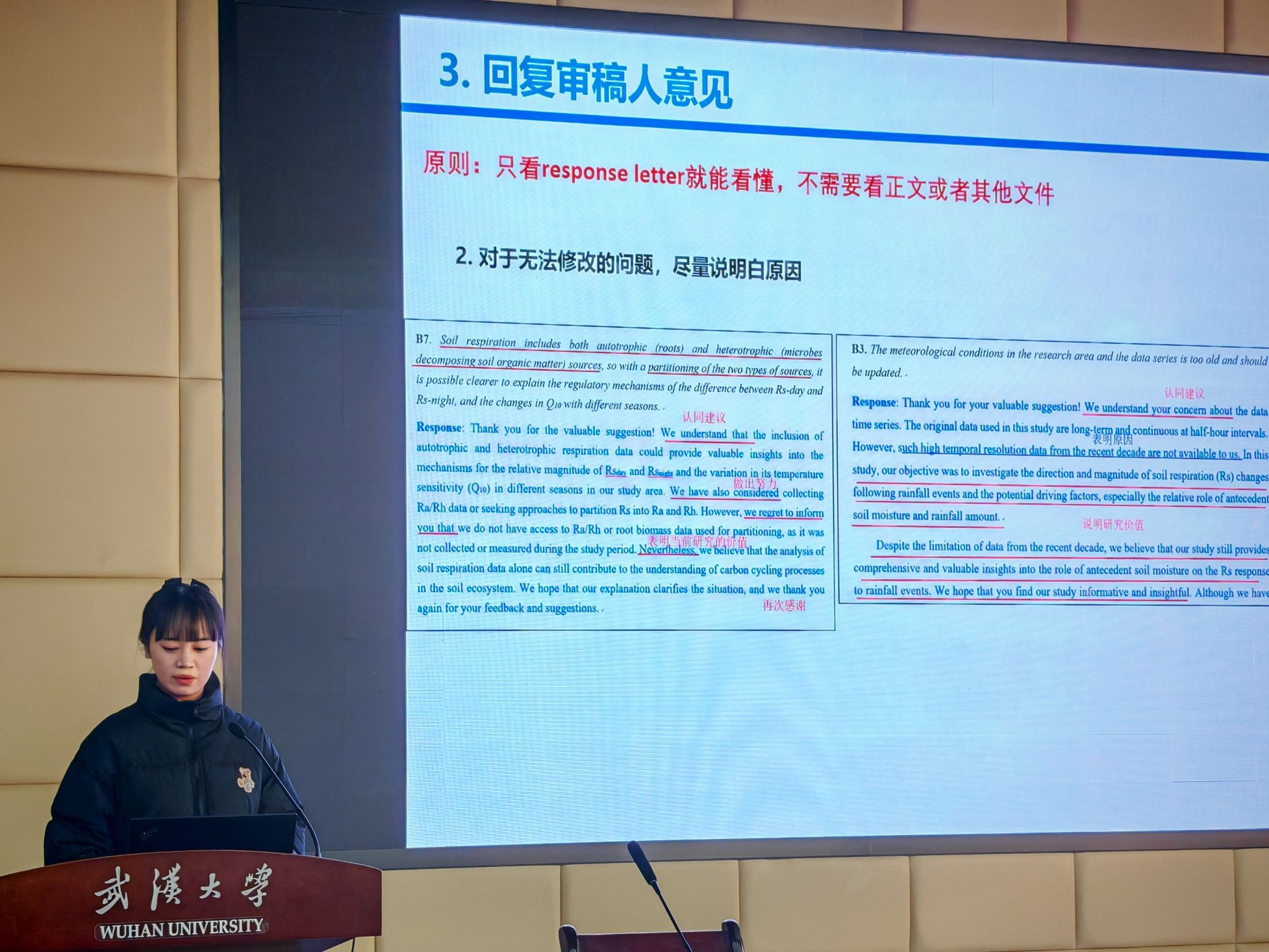 在交流讨论环节,同学们提出了平时科研中遇到的困难和疑惑,包括如何做好生活与科研的平衡、如何写好第一篇英语论文以及各个科研相关软件工具的运用与推荐等,各位嘉宾们运用自身的学术底蕴与丰富经验,逐一为同学们答疑解惑。每场讨论会结束之际,会场老师都会对嘉宾汇报作精炼和梳理,并且进行全面细致的回顾总结。