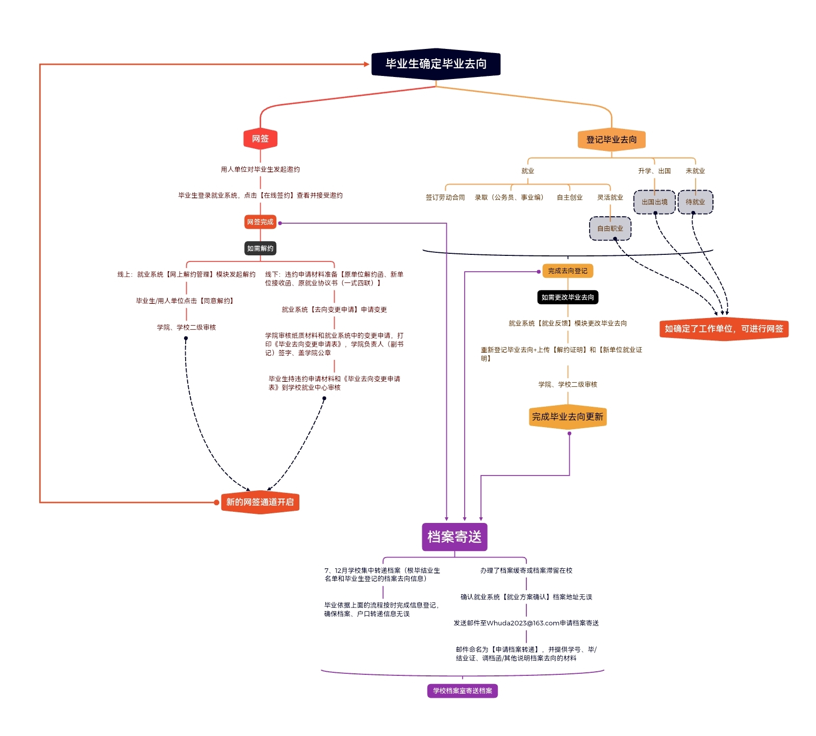 需要变更单位的毕业生可参照上述“解约”流程更新毕业去向信息;原为待就业、出国出境、自由职业的毕业生可以通过与用人单位网签就业协议或通过就业系统中“就业反馈”模块,重新登记毕业去向;不变更用人单位但需要调整档案、户口转递地址的毕业生,也可以通过就业系统中“就业反馈”模块,重新登记户档信息,并提醒学院及时审核。