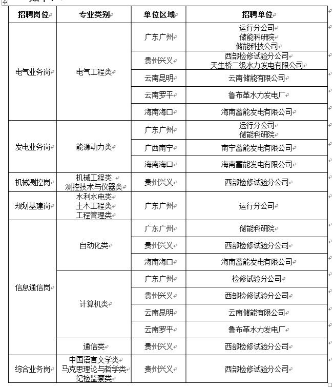 招聘人数约为40人。招聘单位涵盖广东、广西、贵州、云南、海南五省。招聘岗位包括电气业务岗、发电业务岗、机械测控岗、规划基建岗、信息通信岗、综合业务岗。具体要求如下:
