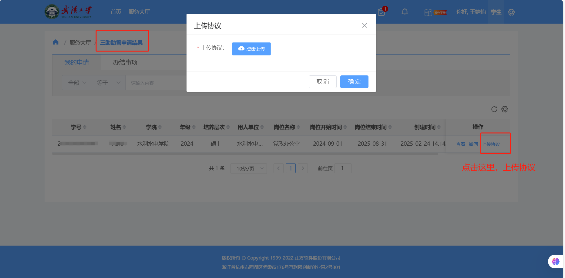 (4)提交申请后,在“全部服务”里点击“三助助管申请结果”(请注意,这里是回到全部服务,点击“三助助管申请结果”这个服务,不是之前的“三助助管申请”)。点击右侧的“上传协议”,将签字盖章的助管协议扫描后上传(协议及填写样式见附件)。