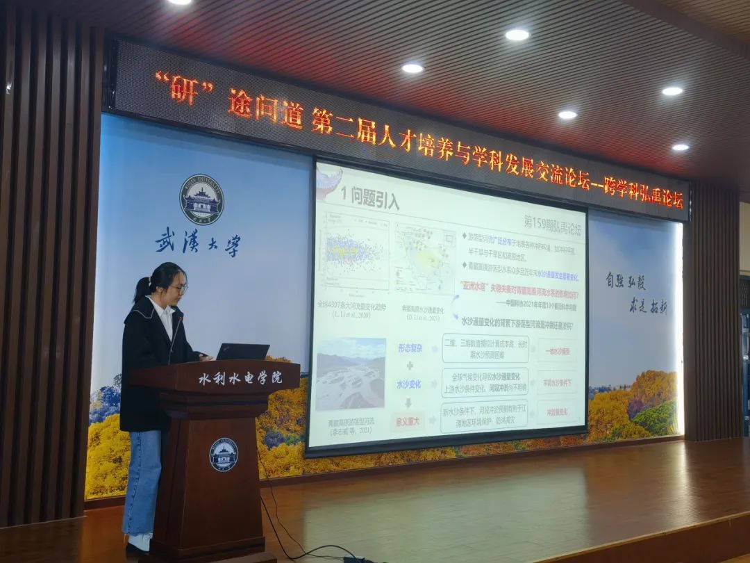 博士生蒋睿菁以《游荡型河流一维概化几何模式及冲淤预测研究》为题进行学术报告。由于全球气候变化和人类活动的加剧,河流水沙通量显著变化,这也使得游荡型河流的形态演变更加复杂。蒋同学提出了一种基于一维槽道概化的几何模式,目的在于将复杂的游荡型河流简化为一维河道,并通过浅水-泥沙-形态耦合动力学数学模型进行模拟。她的研究为游荡型河流的治理及中下游地区的防洪减灾提供了重要的科学依据,具有显著的实践意义。