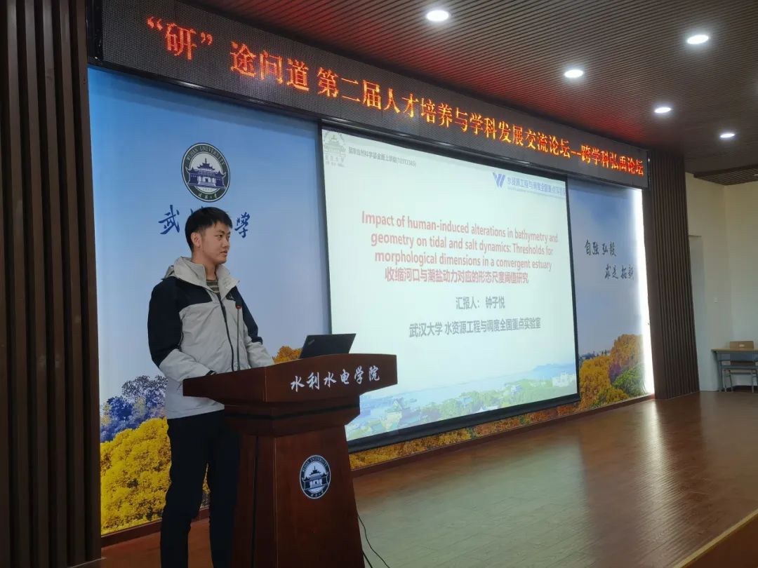 博士生钟子悦以《河口水深与形态变化对潮-盐动力学的影响—收缩河口形态阈值研究》为题进行学术报告。他的研究重点聚焦于伶仃洋河口,探讨了河口收缩与盐水入侵之间的动态关系,并提出了形态尺度阈值的概念。钟同学还介绍总结了几何收敛和地形变化对盐水输运机制的影响。他的研究揭示了河口收缩的临界尺度和盐水动力的复杂机制,为人类活动影响下的河口系统研究提供了新的视角,也为河口保护与治理的科学决策提供有力支撑。