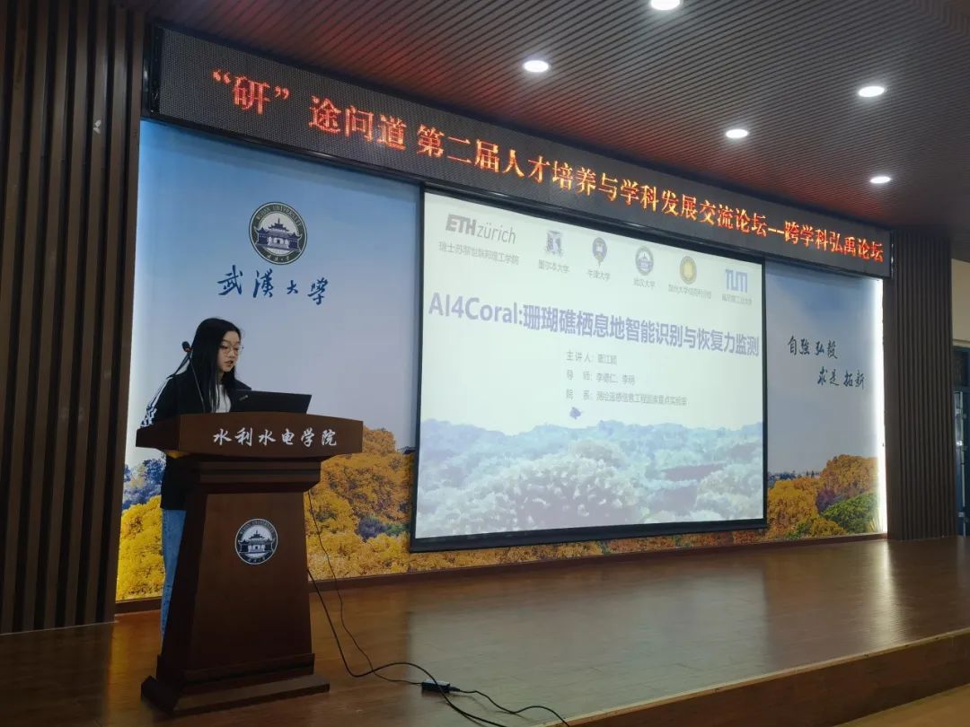 首先,测绘遥感信息工程国家重点实验室博士生覃江颖以《AI4Coral:珊瑚礁栖息地智能识别与恢复力监测》为题进行学术报告。珊瑚礁作为全球最具生物多样性的海洋生态系统之一,正因气候变化与人类活动的双重影响而面临严峻威胁。基于这一挑战,她向大家介绍了自己是如何通过高精度的识别与监测,支持珊瑚礁的可持续管理与保护。通过对研究内容涉及的技术手段的讲解介绍,覃同学深入浅出地为大家展示了利用水下无人机自主进行数据采集,并生成珊瑚礁的精细三维地貌模型的过程。同时她也指出,通过卫星遥感,得以实现对全球珊瑚礁栖息地的精确制图,并为今后应对气候变化背景下的珊瑚礁动态监测提供智能化决策支持。