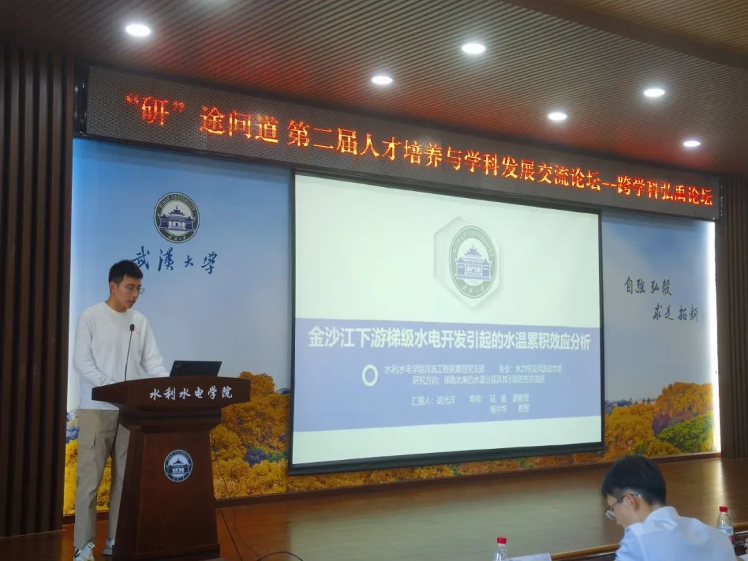 硕士生胡光洋以《金沙江下游梯级水电开发引起的水温累积效应分析》为题进行学术报告。金沙江下游的梯级水库群在流域水温调控中起着关键作用,但目前对其下泄水温的影响尚未有充分的认识。胡同学基于实测数据,从水温基线偏移、相位偏移、极值变幅等多个角度,为大家定量分析了四座大型水库(龙街、乌东德、白鹤滩、溪洛渡)的联合运行对水温的累积影响。而今后他的进一步研究也将为金沙江下游梯级水库的科学管理和生态保护提供了重要的理论支持。