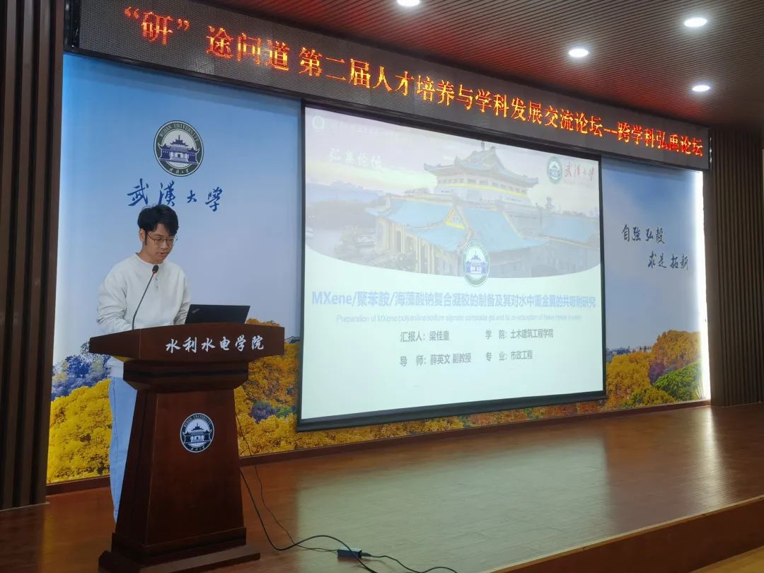 接下来,土木建筑工程学院硕士生梁佳童以《MXene/聚苯胺/海藻酸钠复合凝胶的制备及其对水中重金属的共吸附研究》为题进行学术报告。考虑到水体中的重金属因其持久性和毒性,已对环境和人体健康构成重大威胁这一现实情况,梁同学介绍了一种由他设计并合成的新型复合吸附材料,该材料具有稳定且可再生的特性,不仅能在复杂水环境中表现出强大的吸附能力,同时还具备优异的化学稳定性和可循环使用的特性,大幅提升了重金属去除效率。他的研究为解决水体重金属污染提供了新的技术途径,展现了高效、可持续的吸附材料在环境保护中的应用潜力,具有重要的环境意义和应用前景。