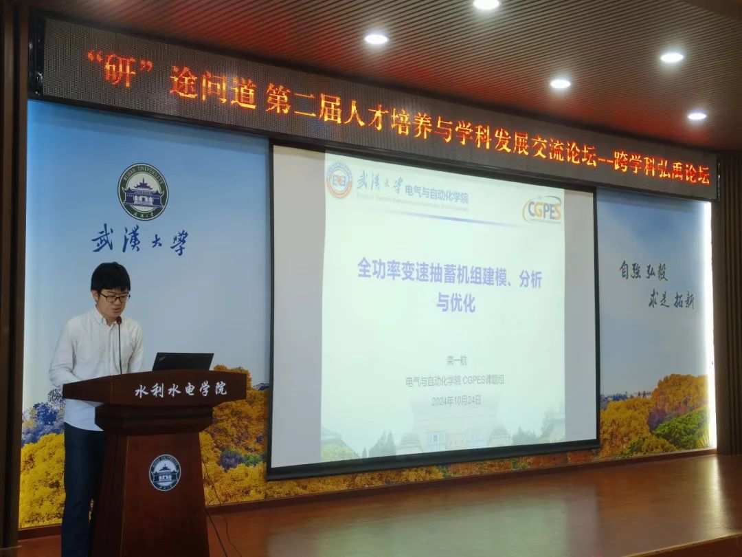 随后,电气与自动化学院直博生栾一航以《全功率变速抽水蓄能机组建模、分析与控制》为题进行学术报告。针对我国抽水蓄能储能手段的规模与巨大的发展潜力,栾同学则从整体模型、控制策略、运行特性、优化方案等方面,基于全功率变速抽蓄机组的运行特性与控制策略研究向大家介绍了自己的研究成果。他指出,该研究的深入推进也将为未来全功率变速抽蓄机组在实际电网中的应用提供了可靠的理论支持。