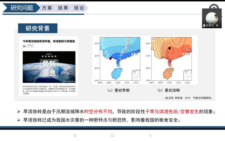 博士生朱瑞首先作了题为《旱涝急转对水稻光合特性的累积效应》的报告。在报告中朱瑞同学说到近20年来,极端水旱灾害频繁发生,对我国长江、淮河下游水稻生产造成了不利影响,其中旱涝急转现象最为突出。这种频繁发生的自然灾害严重威胁着中国的粮食安全,虽然有大量研究揭示了干旱或洪涝对作物的影响,但旱涝急转对作物的影响并不等同于单一干旱和淹涝胁迫的简单相加。因此,探索水稻的生理特性对旱涝急转的响应特征与机理,对于制定合理的减灾措施具有重要意义。通过设置系统的田间试验,我们发现前期干旱提高了水稻对后期淹涝的耐受能力,而后期干旱加重了前期干旱对水稻的不利影响,即前旱与后涝之间同时存在着拮抗与协同效应,此结果拓宽了目前有关干旱与洪涝对作物相互作用的认知。