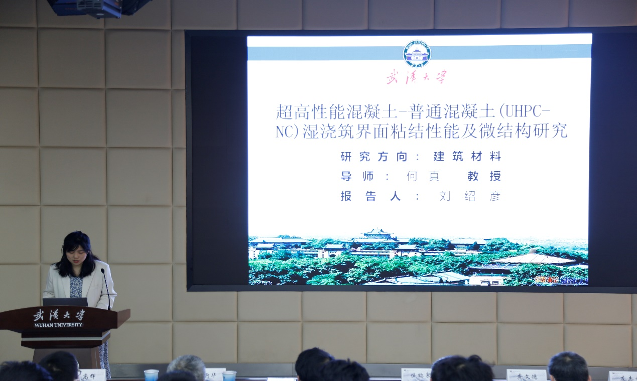 首先,刘绍彦同学以《超高性能混凝土-普通混凝土(UHPC-NC)湿浇筑界面粘结性能及微观结构研究》为题进行学术报告。报告中刘绍彦同学首先介绍了超高性能混凝土(Ultra-high performance concrete,简称UHPC)的优缺点,同时指出,在UHPC-NC复合构件制造中,若采用传统的“fresh-on-harden,FH”浇筑法,则需要额外的界面处理,且形成了粘结性能薄弱的界面过渡区。相比之下,“fresh-on-fresh”湿浇筑法可得到更加致密的界面结构和良好的粘结性能,同时节约了制造时间,避免了因界面处理不当引入缺陷的风险。报告对UHPC-NC湿浇筑界面的宏观粘结性能及关键影响因素进行了分析,并对微观结构进行了研究。