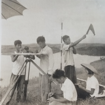 第二天开始测量,崔老师对每个小组提出测量要求、注意事项,强调最终成果需要应用到工程中去,一定要保证质量。大家很兴奋,想到可以做点实事了,但又耽心测不好。而此时全班同学都信心百倍,深深感动着我,决心一定把测量搞好。农历七月伏天,艳阳高照,阳光似火,地面晒得滚烫,全身烤得发烧,所有男同学,都有“烧裆”,即会阴部溃烂,但没有同学叫苦、叫累,默默坚持测绘。每组分工是:两个同学跑尺,一前一后轮换,跑尺须扶稳标杆,随时挪动位置,必须避开高坡低坎,巨石坑塘,在草丛荆棘中战胜蚊虫蚂蚁、毒蛇蜈蚣;一人挥舞小旗、吹口哨,扯着嗓子高声喊叫或用手势控制;一人看经纬仪并读报数值,汗流满面一会就浸湿镜头,模糊得看不清,睁一只眼、闭一只眼,反复核对多次,最后才能报出准确数据;一人作记录并填写数据,汗流浃背,用毛巾不停擦汗,怕让汗珠滴到图板上弄糊图纸;另一人帮旁边同学打扇,边记录数据,复核检查校对兼整体协调。没有全站仪、没对讲机、没手机,更没无人机;只有经纬仪、小旗子、口哨、铅笔、计算尺和记录本,通过协调配合,才能完成测量任务。所有同学顶着烈火骄阳,不停换岗,把最苦、最累工作揽给自己做。经过1~2天实战,发现清早测量效率最高,故第二天大家天不亮就起床,趁凉快,抓紧时间测绘,待太阳升顶就歇一歇,果然功效提高。每天中午收工,男同学顺着库水游泳到管理所吃饭,午睡1~2小时,下午四点接着干。由于采用早干晚收办法,终于按时按质按量完成测量任务,经过10多天奋战,胜利结束实习。
