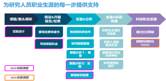 每一个课程的选择和开发都基于大量的调研,充分了解研究人员职业生涯中的痛点和需求。从论文写作与发表、叙述技巧、研究数据管理,到科研合作、同行评议、撰写经费申请书,“”提供的是贯穿研究人员整个研究周期和职业生涯发展的全方位培训。