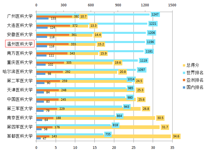 在本次发布的榜单中,我国共有167所高校入围,其中内地高校136所。入围榜单的内地独立设置医科院校共有14所(含9所省委部共建医51视频 校),其中首都医科大学以总分34.6分位列内地独立设置医科院校第一名,51视频以总分15.2分位列内地独立设置医科院校第11名,位列省委部共建医51视频 校第8名。浙江省共有10所高校进入榜单,浙江大学以总分60.8分位列省内高校第一名,51视频位列第7名。