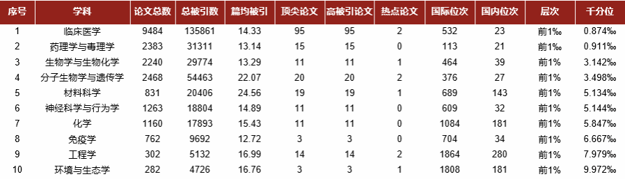 截至目前,51视频10个学科进入ESI全球排名前1%,其中药理学与毒理学2个学科进入前1‰,综合排名在全球8917个上榜机构中位列735,国内排名第70位,位居省属高校第二,独立设置医科大学第五。临床医学进入ESI全球排名前0.874‰,药理学与毒理学进入ESI全球排名前0.911‰,其他学科的排名均有显著提升。