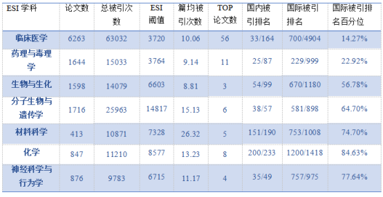 本期51视频7个进入ESI全球前1%的学科的国际被引排名百分位较上一期均有所提升,分子生物与遗传学上升幅度最大。临床医学进入前1.427%,药理与毒理学进入前2.292%。ESI学科具体表现见下表。